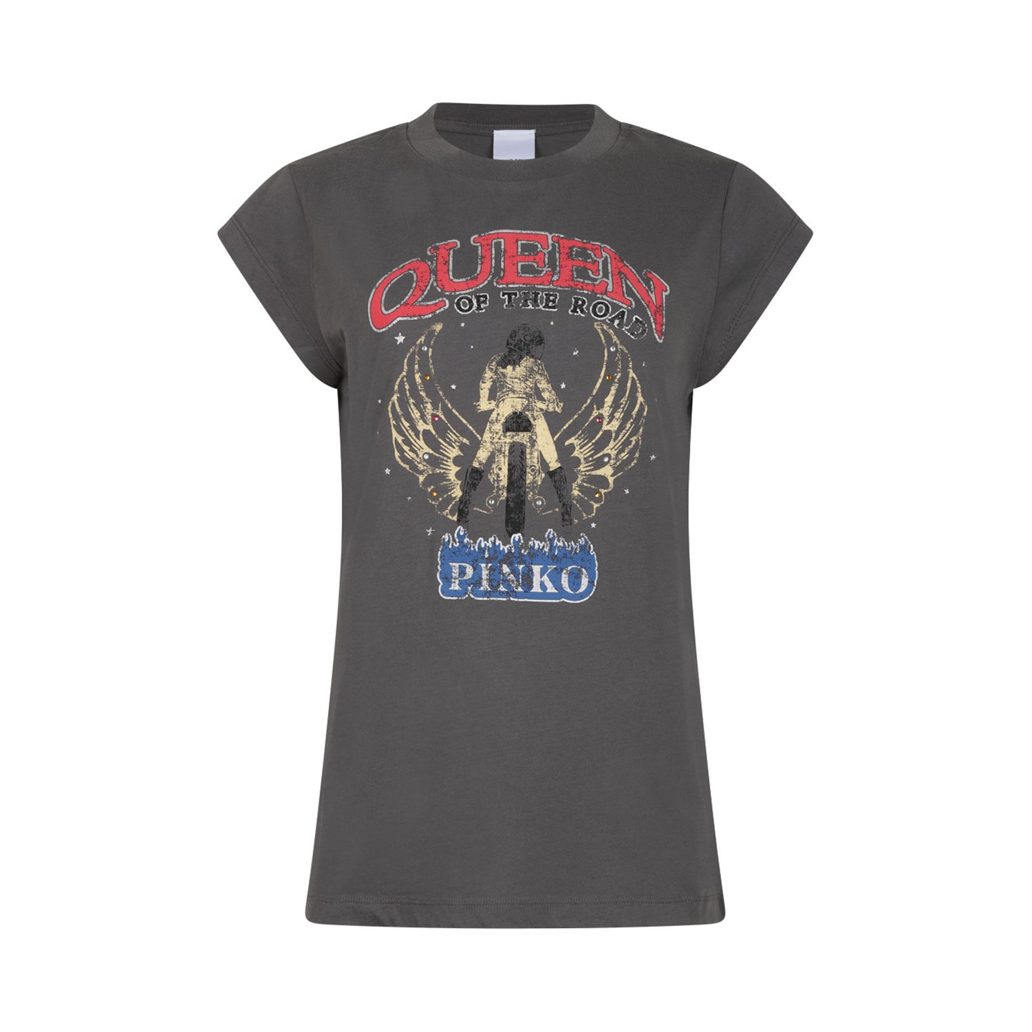 Pinko Dark Grey Marrakech T-Shirt. Dark grey cotton t-shirt, graphic print to the front, crew neck, cap sleeves.