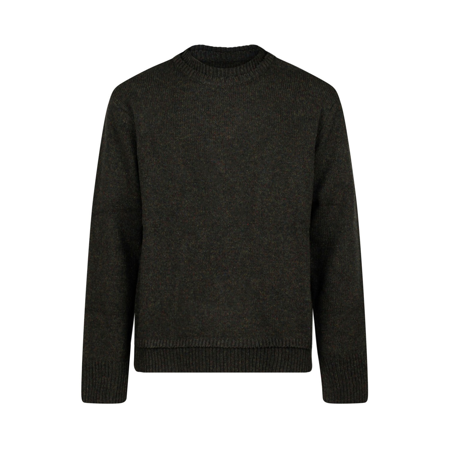 Maison Margiela Fark Green Sweater. Fark green wool sweater, crew neck, ribbed finishes, suede elbow patches. Shelled details, four stitches on the back.