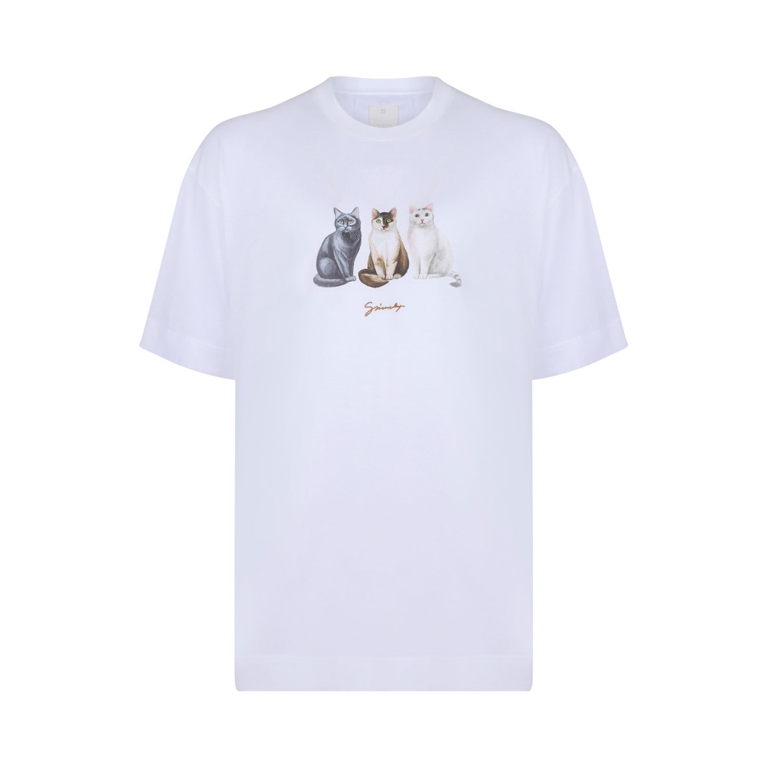 Givenchy White Cats Print T-Shirt. White cotton t-shirt, short sleeves, crew neck, small Givenchy embroidered on the front.