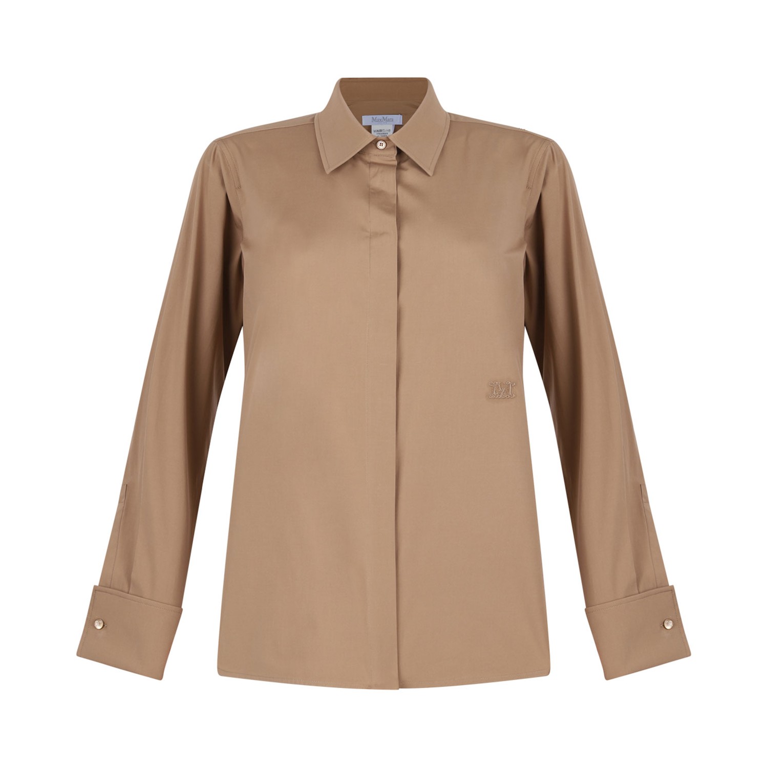 Max Mara Hazelnut Poplin Shirt. Hazelnut long-sleeved shirt in stretch cotton poplin, decorated with a small M Monogram embroidered in tone-on-tone thread on the front. Masculine-inspired model with a classic pointed collar and high cufflinks. Concealed front fastening with hidden buttons.
