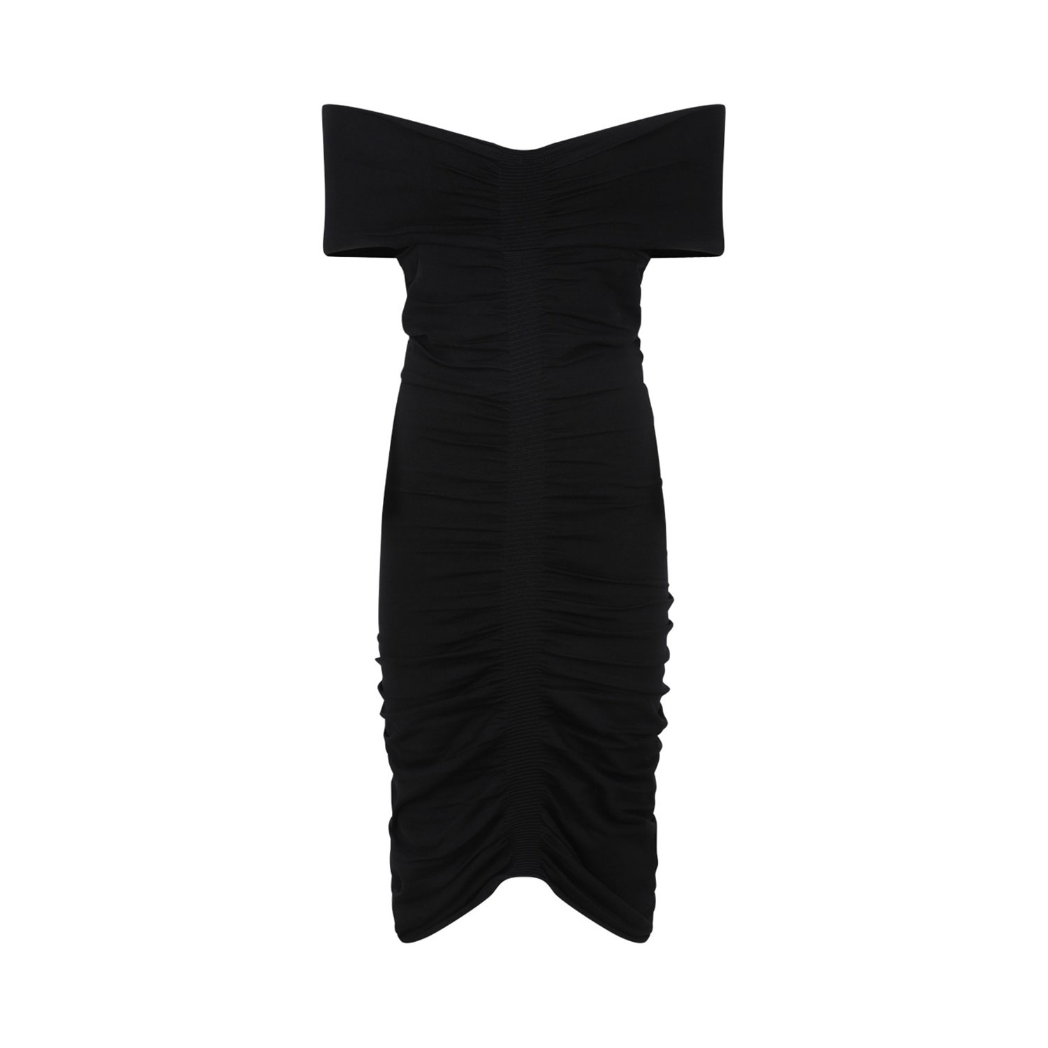 Alexander Wang Black Mini Dress. Black off shoulder mini dress, ruched detailing, asymmetric hem, rolled trim.