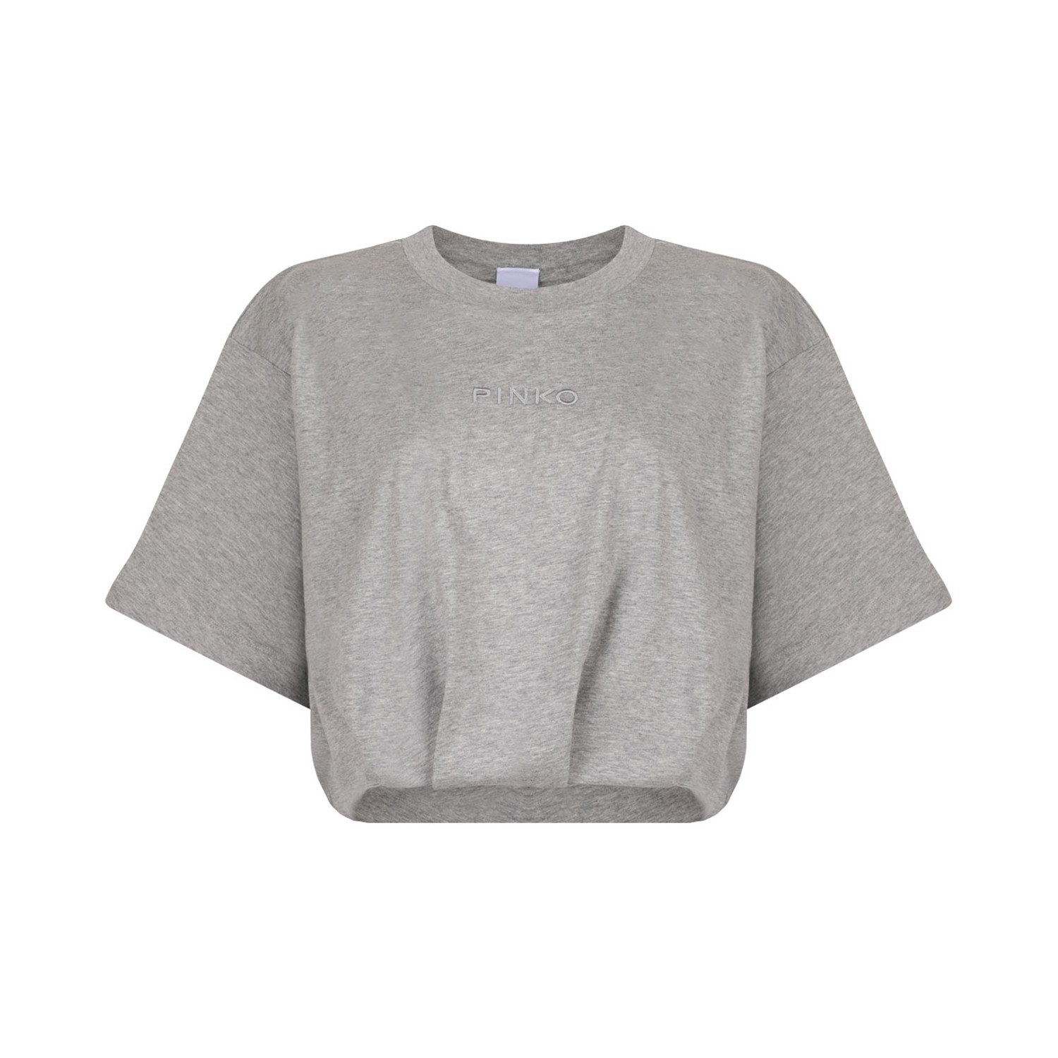 Pinko Light Grey Logo Embossed T-Shirt. Light grey cotton t-shirt, logo-embroidered to the front, crew neck. Short sleeves, cropped, gathered detailing.