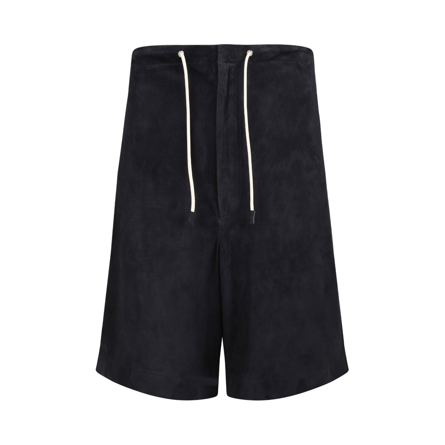 Emporio Armani Black Suede Shorts. Black suede shorts, concealed front fastening, drawstring waist, two side slit pockets, rear patch pocket.
