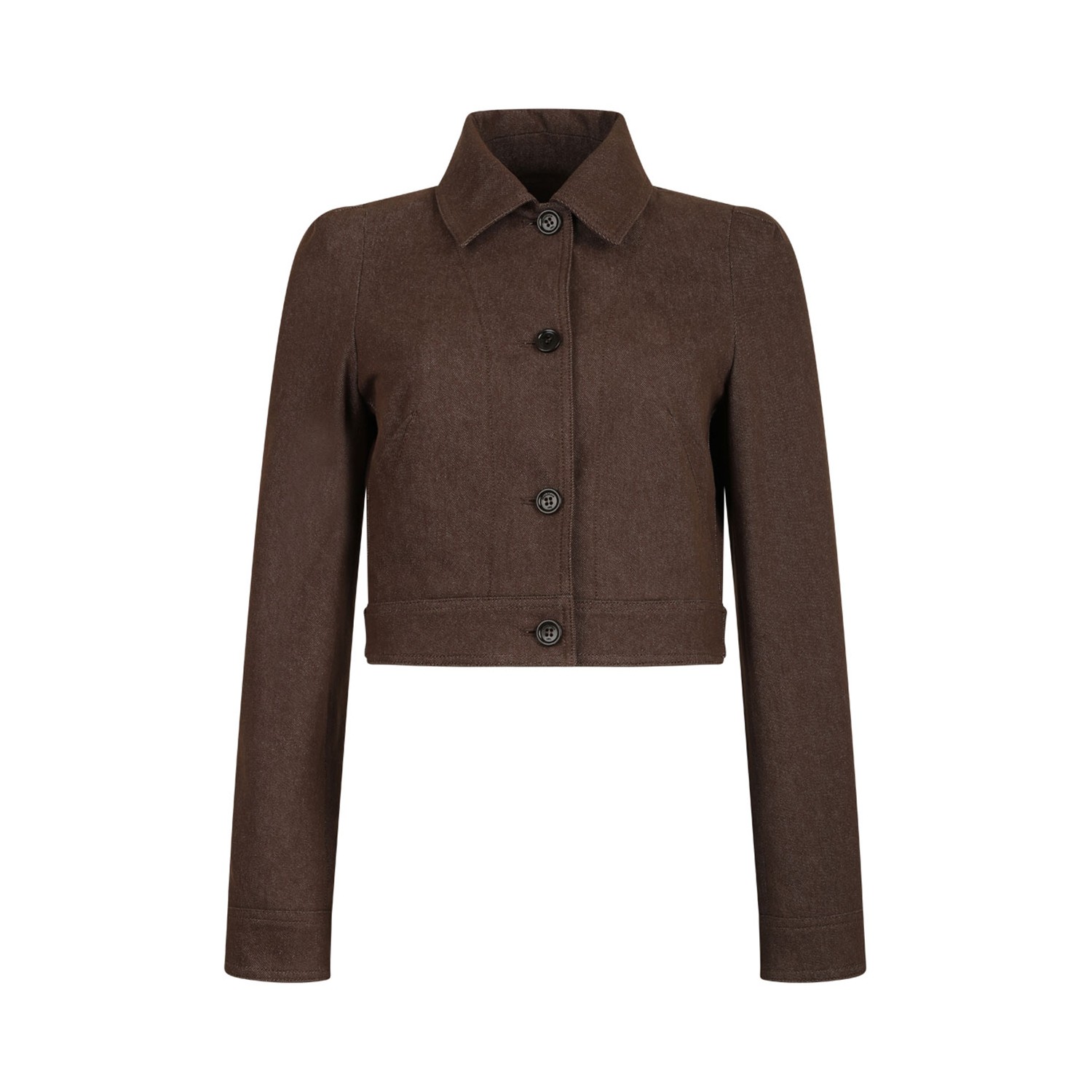 Max Mara Brown Cropped Jacket. Brown slim-fit cropped jacket made of pure cotton denim-effect fabric. Lined garment featuring big shoulders, a collar and long shirt sleeves. Featuring a stitched pleat motif on the front and shoulders. Single-breasted closure with visible buttons.