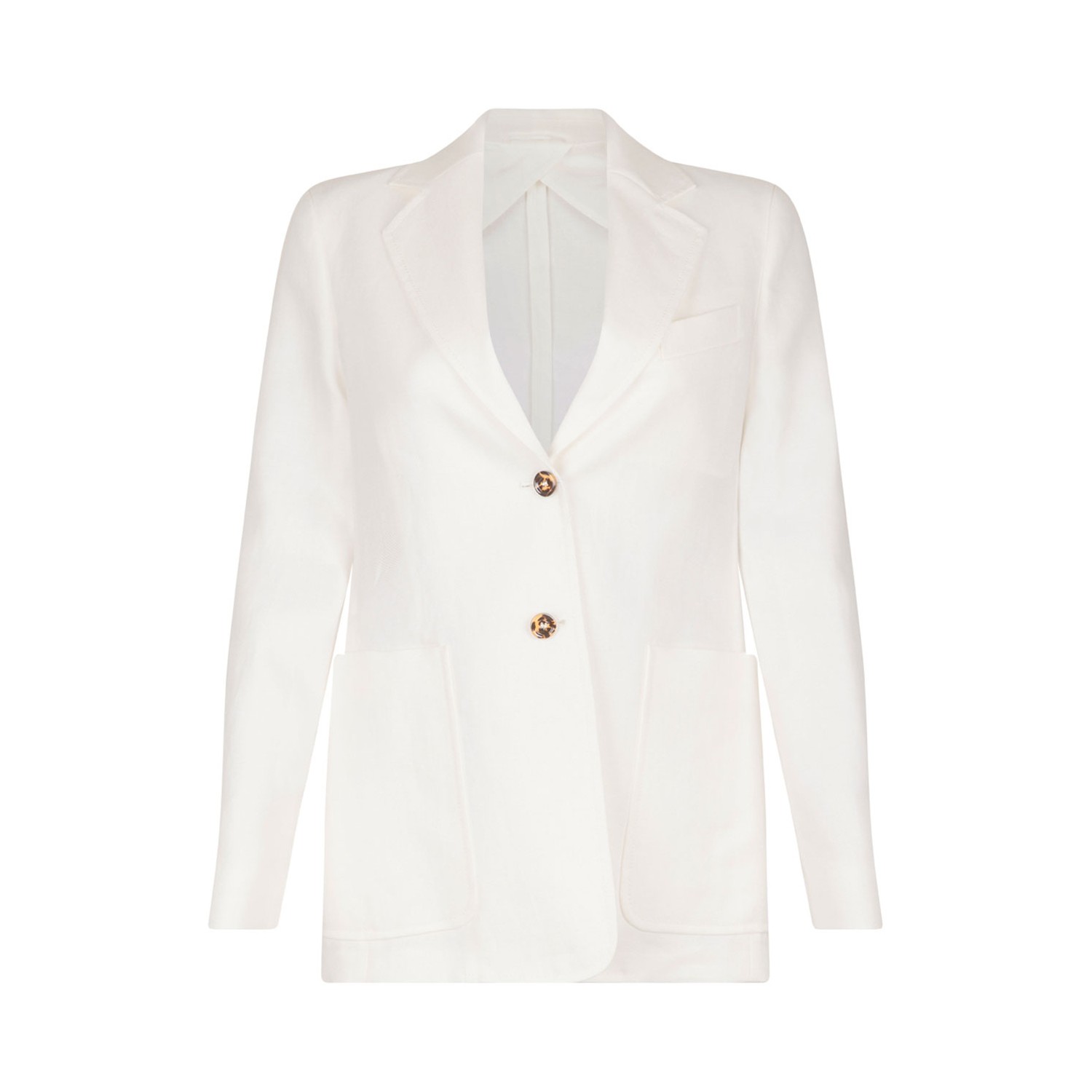 Max Mara White Guglia Blazer. White single-breasted blazer with a semi-fitted line, made of pure linen diagonal fabric. The model features a lapel collar, set-in sleeves with buttons on the cuffs and patch pockets on the front. Finished with a breast pocket and a central vent on the back. Front closure with two buttons.