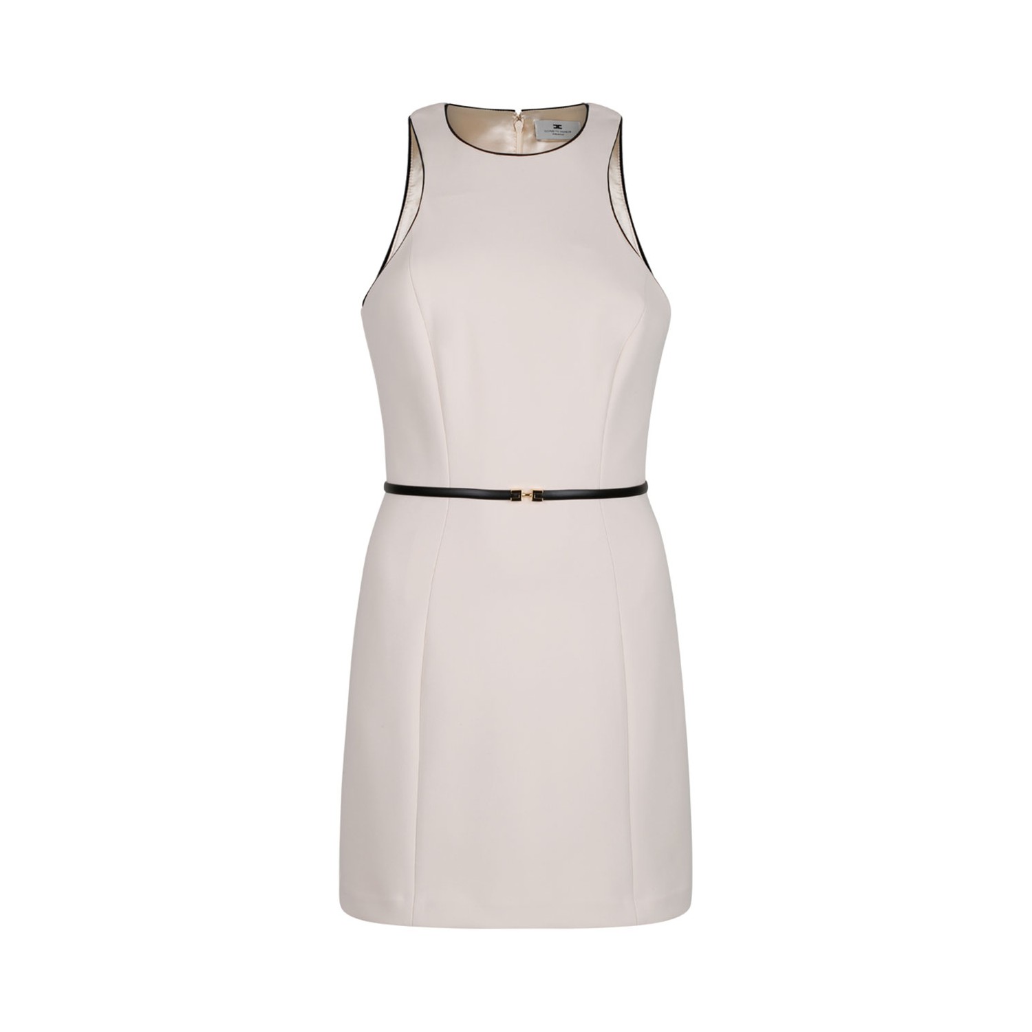 Elisabetta Franchi Cream Contrasting Belt Dress. Cream sleeveless dress in stretch crepe with a slightly rounded mini skirt. The dress stands out for its piping details and contrasting belt, embellished with a micro clamp with enameled logo.