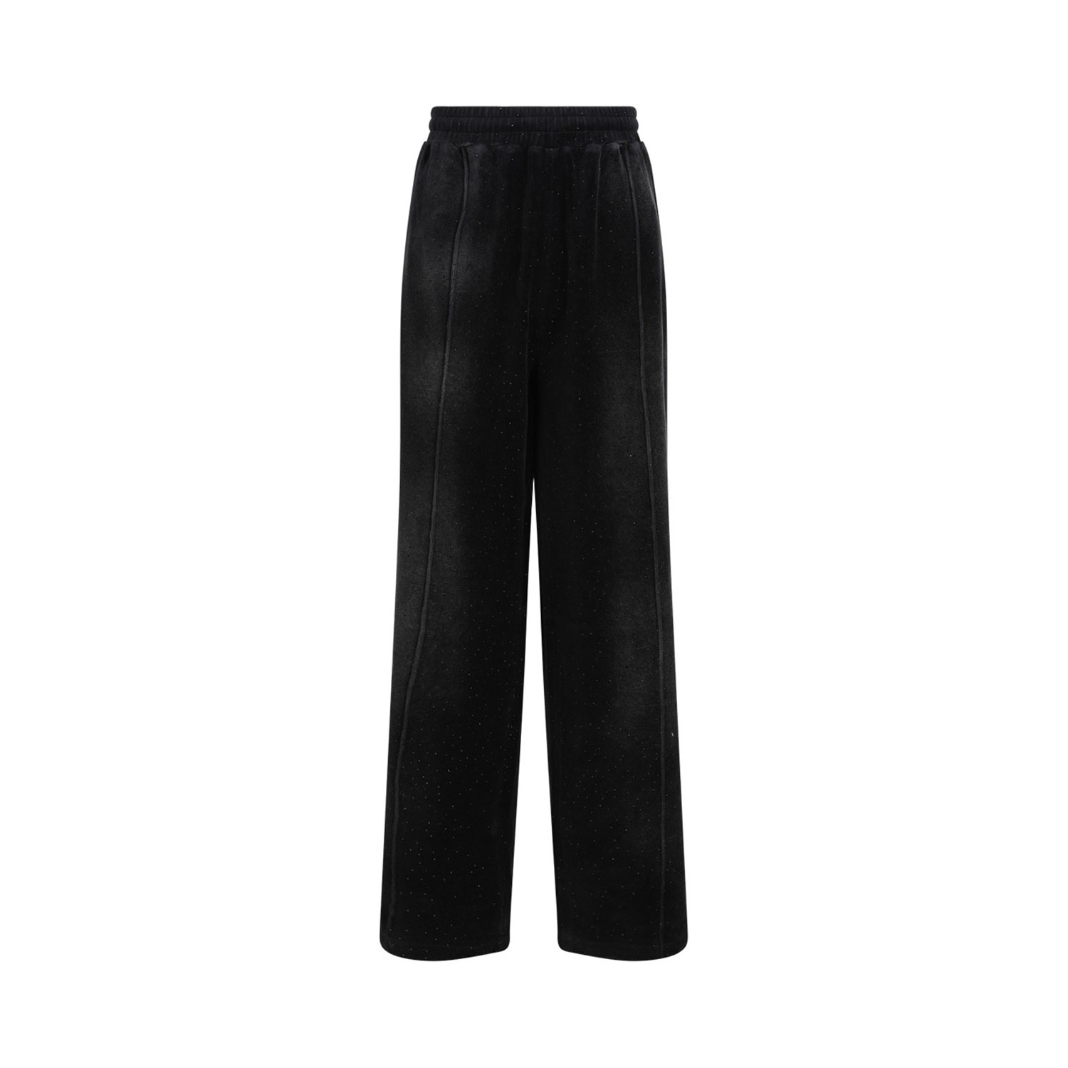 Alexander Wang Velour Sweatpants. Dark grey velour track pants with heat-applied rhinestones. Designed in a relaxed, loose fit, this refined casual style features a drawstring waist, side seam and logo detailing at the bottom.