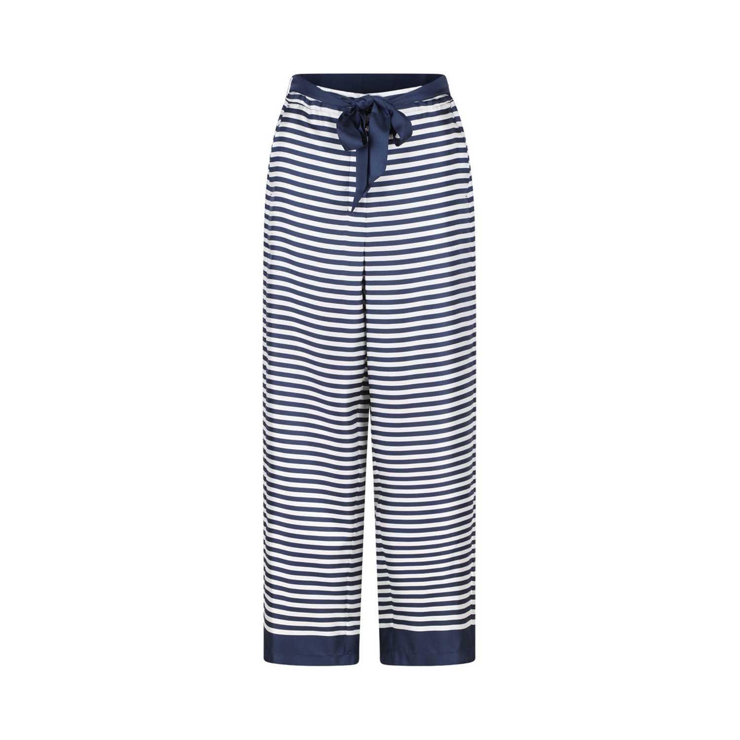Max Mara Ecru and Blue Printed Trousers. Ecru and blue straight-cut trousers in fine pure silk twill with an all-over printed motif. The model features a contrasting band on the bottom, an elasticated waist on the back and French pockets on the sides. The matching belt highlights the silhouette. Closure with a high waistband, zip with flap and hook.
