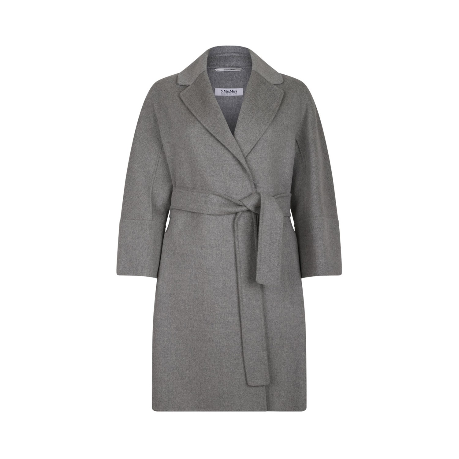 Max Mara Pearl Grey Arona Coat. Short coat in fine double pure wool fabric sewn by hand, characterized by a wide line slightly closed at the bottom. Unlined model with small lapel collar, kimono sleeves on the front and raglan on the back, and pockets inset on the sides. The matching belt allows to highlight the silhouette.