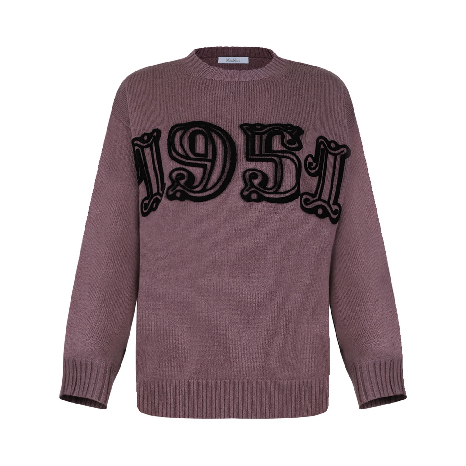Max Mara Malva Fido Sweater. Malva crewneck sweater in fine wool and cashmere blend yarn, decorated with a 1951 flocked motif on the front. Oversized model with long low-cut sleeves and ribbed edges.