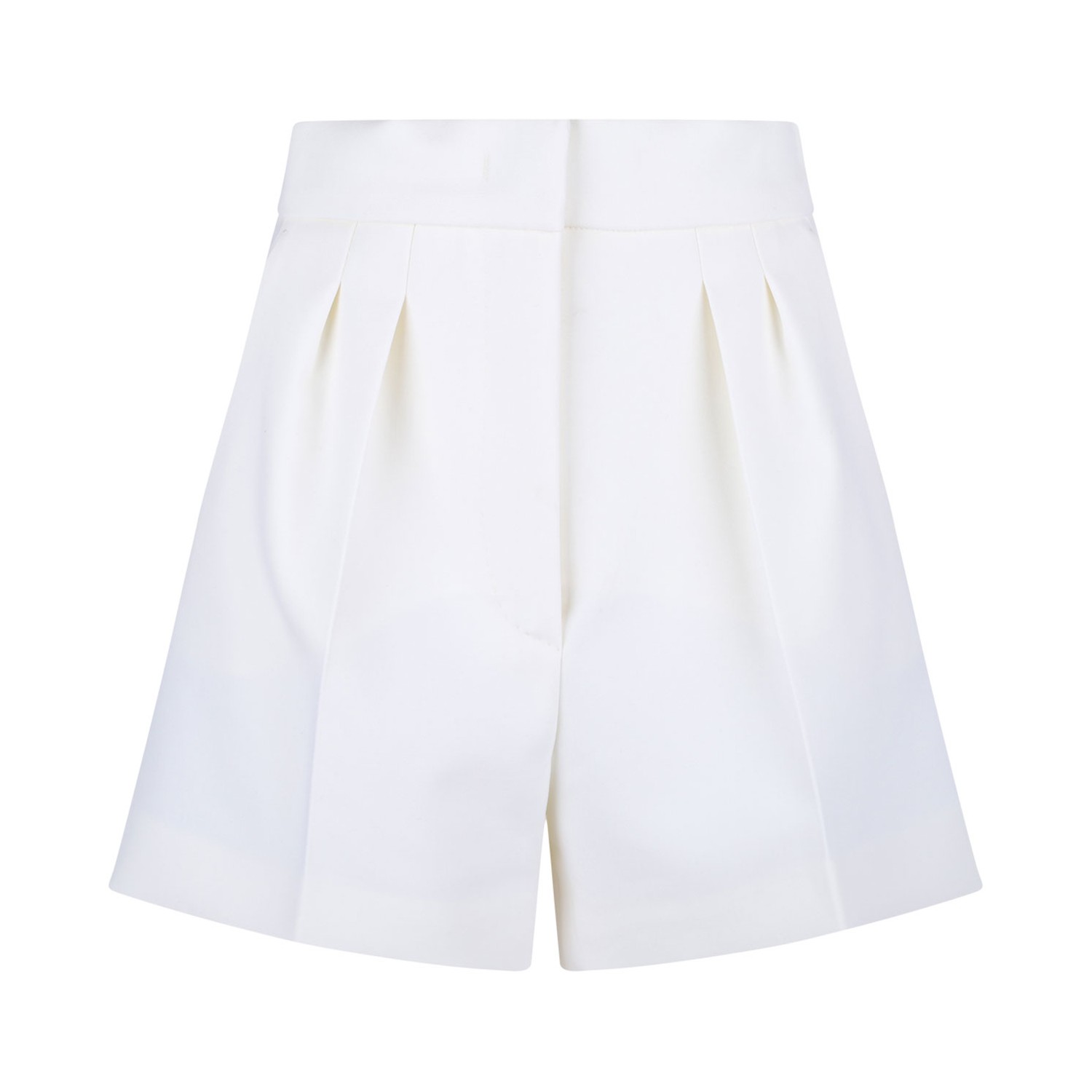 Max Mara White Zic Shorts. White shorts in double stretch wool canvas, featuring a high-waisted silhouette with double pleats on the front, pressed pleat and French pockets on the sides. Lined model, it closes with a high waistband, zip with flap and hook.