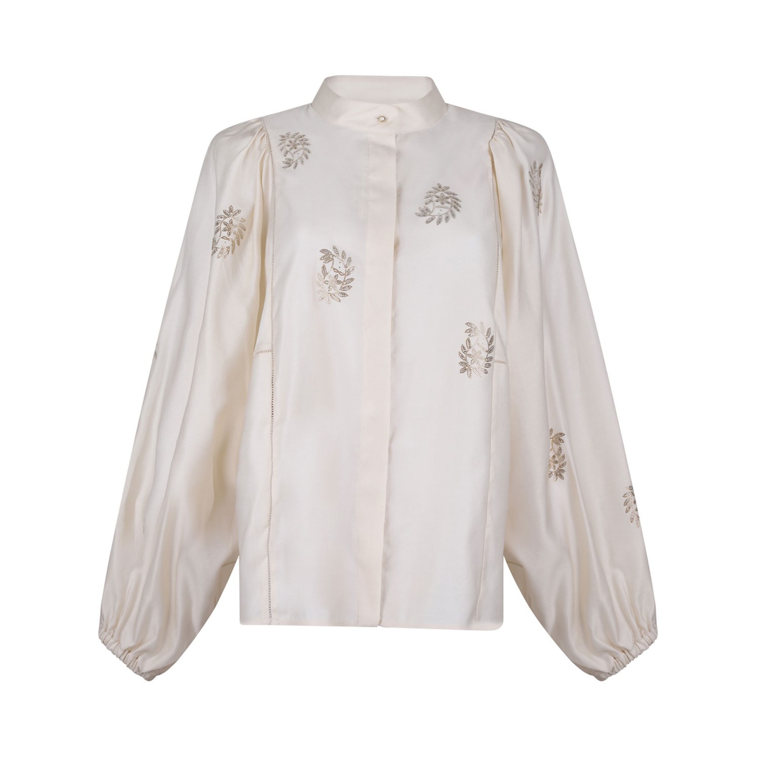 Max Mara Ivory White Shirt. Shirt in precious lightweight pure cotton satin. The embroidery placed on the front and sleeves creates a dynamic effect thanks to their different direction, while the inlaid trimming details embellish the garment on the front and back. The model is characterized by a mandarin collar and wide long balloon sleeves with elastic cuff and gathered shoulder. Finished with small rounded slits on the bottom. Front closure with hidden buttons.