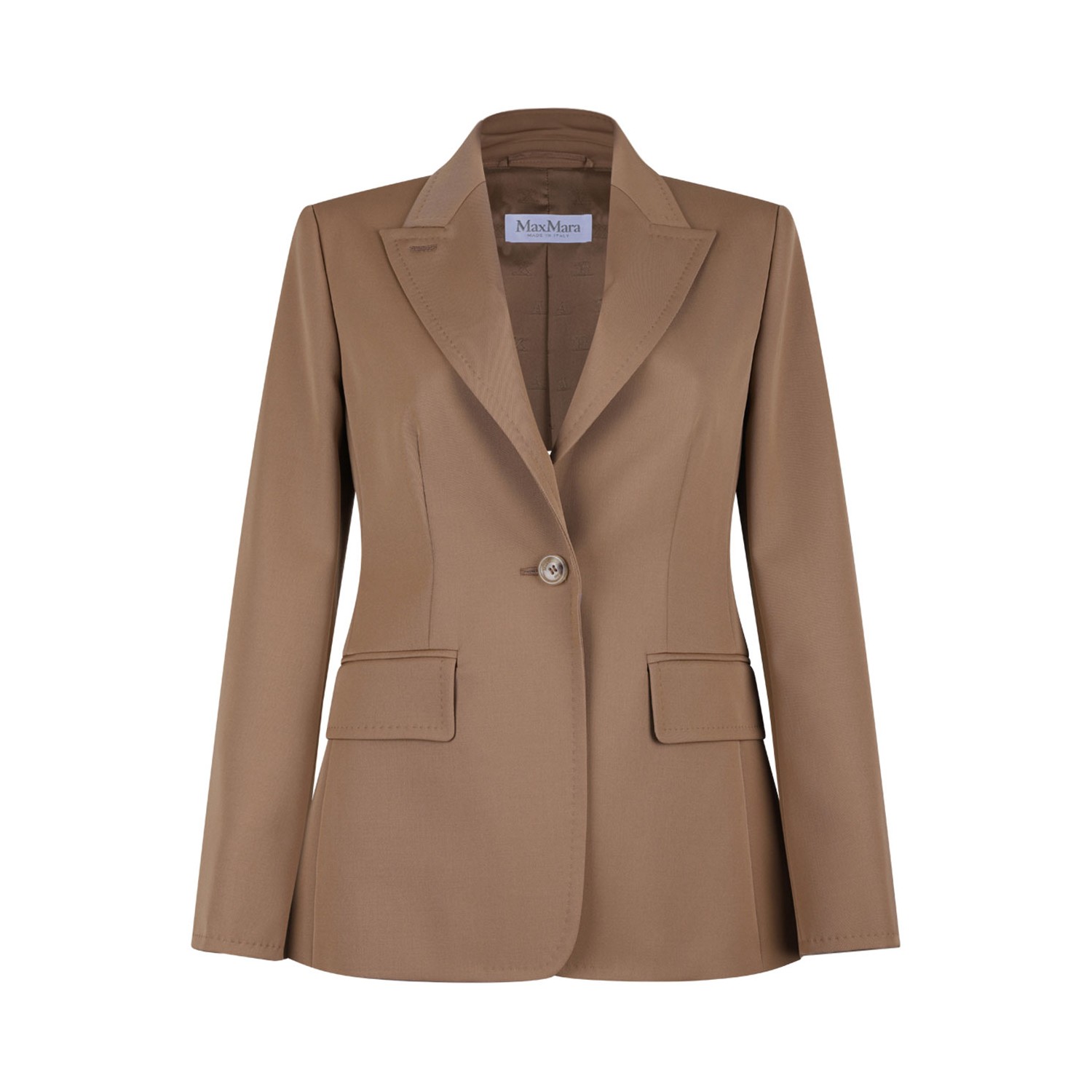 Max Mara Palchi Blazer. Camel blazer, front button fastening, shoulder pads, two side flap pockets, English rear vents.