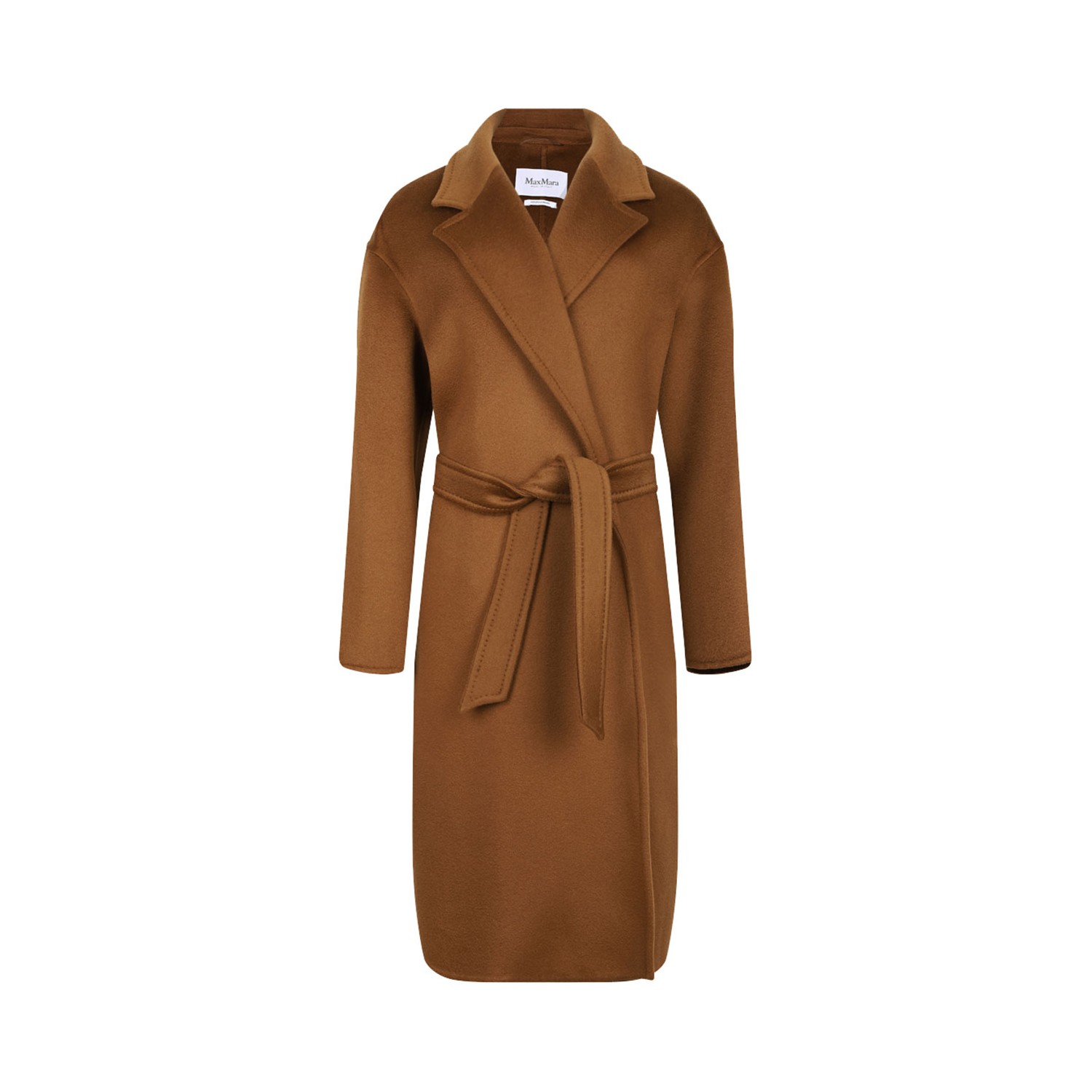 Max Mara Melinda Coat. Brown cashmere coat, detachable belt, two side inset pockets, long sleeves.