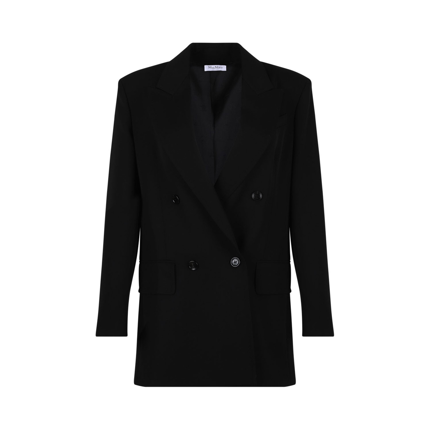 Max Mara Black Straight Blazer. Black double-breasted blazer made of lightweight pure wool gabardine and distinguished by a straight silhouette with slightly oversized shoulders. Constructed with peak lapels, a breast pocket and double-welt pockets on the front. The garment is lined and features lateral vents on the back and long set-in sleeves with buttons on the cuffs. Slightly low closure with visible buttons.