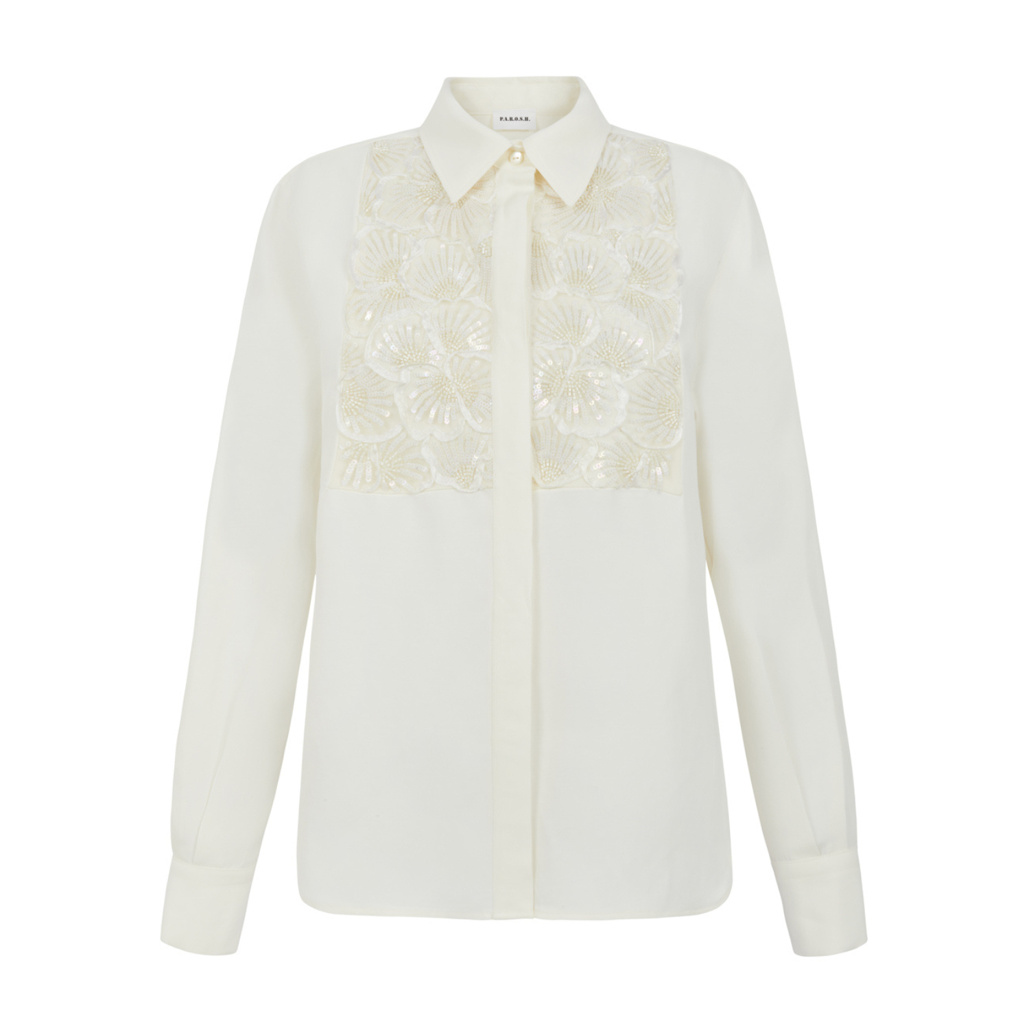 P.A.R.O.S.H. Cream Floral Decoration Shirt. Cream white shirt with classic collar, front button fastening, floral decoration to the front, long sleeves, buttoned cuffs.