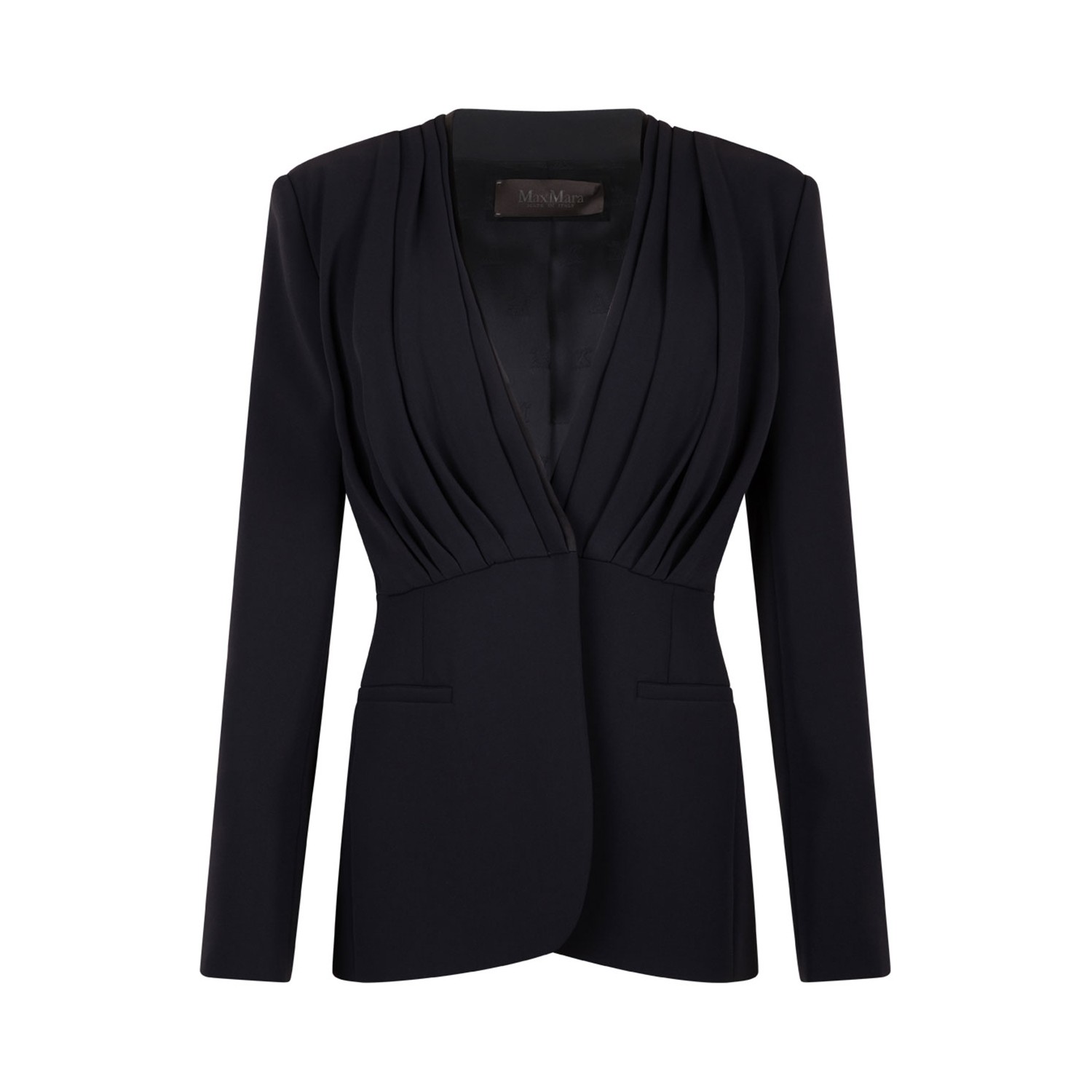 Max Mara Navy Blue Jacket. Navy blue feminine collarless jacket, made of lightweight cady with a draped bodice, high waist with a gathered motif at the back and peplum at the hips. Finished with a V neck edged in tone-on-tone satin, welt pockets and a centre vent at the back. Set-in long sleeves with covered buttons and a logo button on the cuffs. Lined, it closes at the front with an invisible hook.