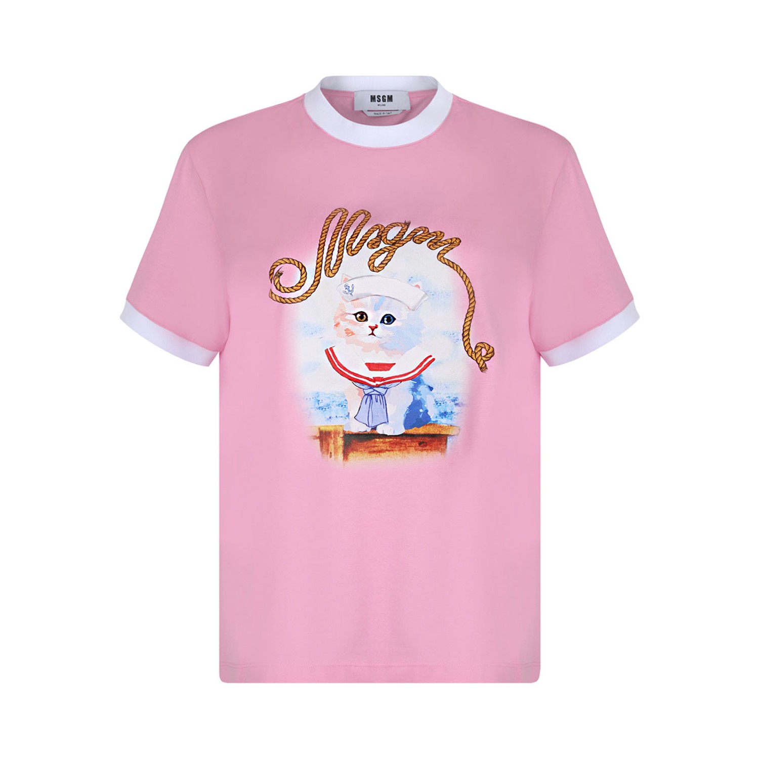 MSGM Pink Graphic Print T-Shirt. Pink cotton t-shirt, crew neck, graphic print to the front, short sleeves, ribbed cuffs.