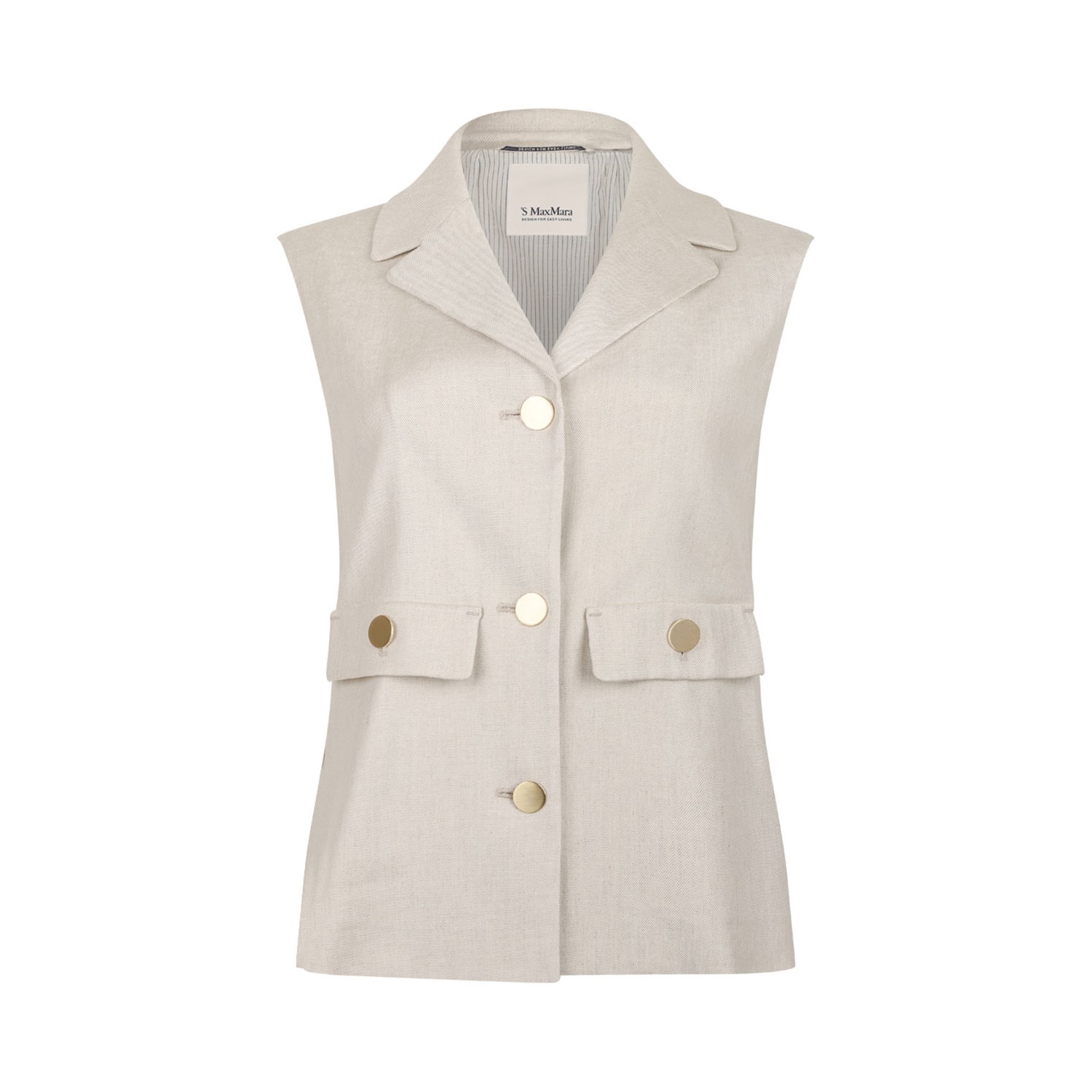 Max Mara Ecru Twill Gilet. Ecru waistcoat crafted from soft, stretch linen blend twill. Single-breasted with gold metal buttons, notched lapels and decorative button-down plackets at the front. Side and back vents. Regular fit. Partially lined in cotton.