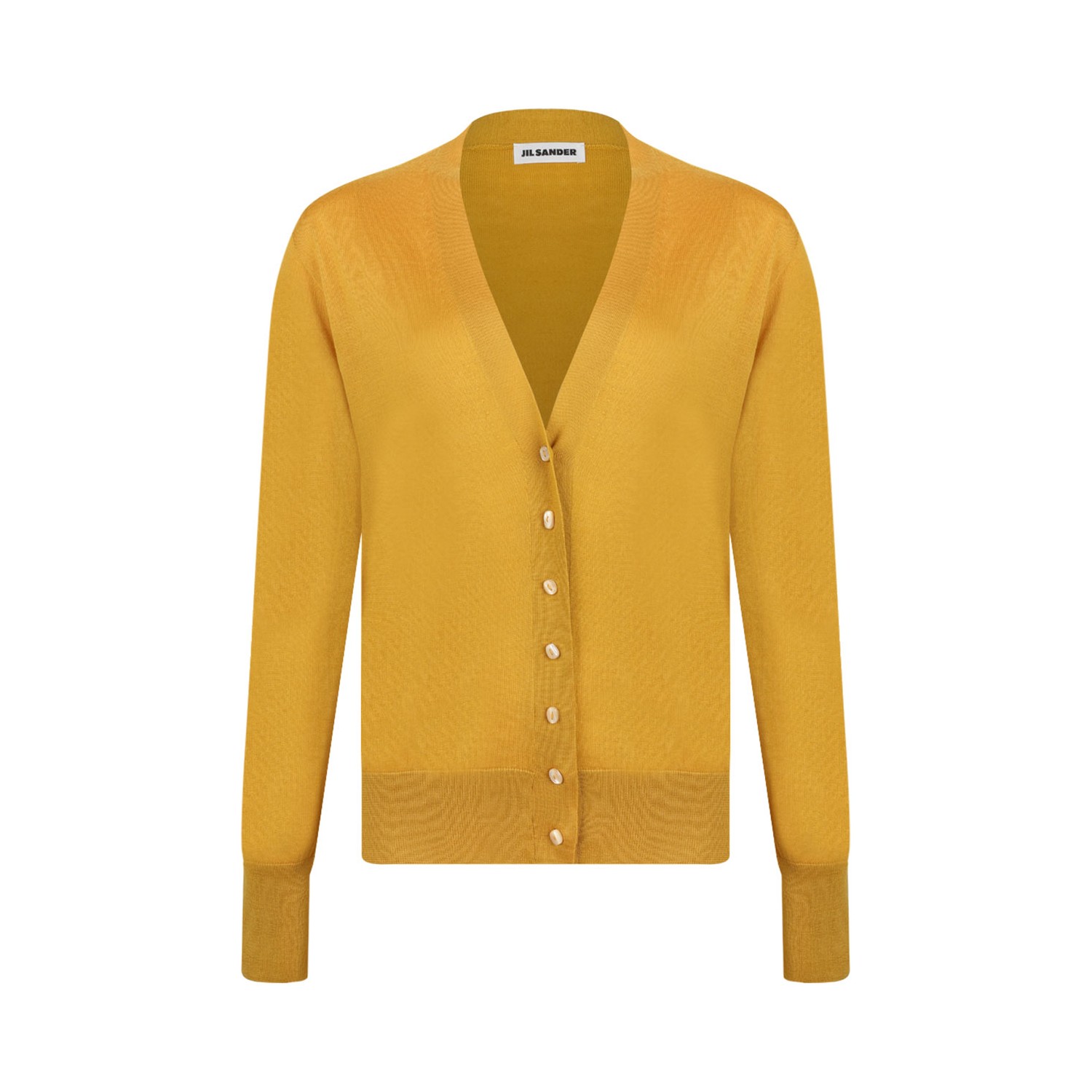 Jil Sander Dark Yellow Knitted Cardigan. Dark yellow wool cashmere blend cardigan with front button fastening, V-neck. Long sleeves, ribbed cuffs and hem, straight hem.