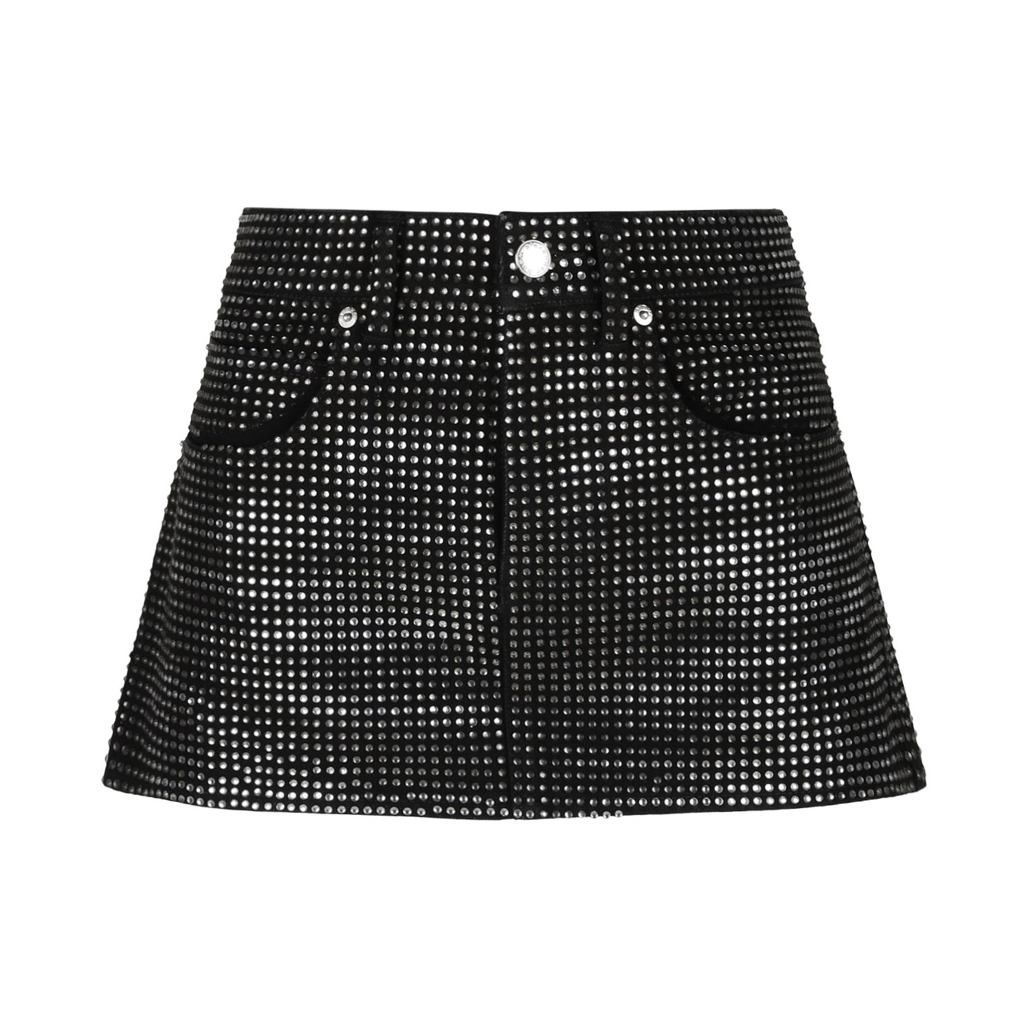 Alexander Wang Black Mini Skirt. Black crystal embellishment mini skirt, low rise, front button and zip fastening. Belt loops, classic five pockets, logo patch to the rear. Thigh length and straight hem.