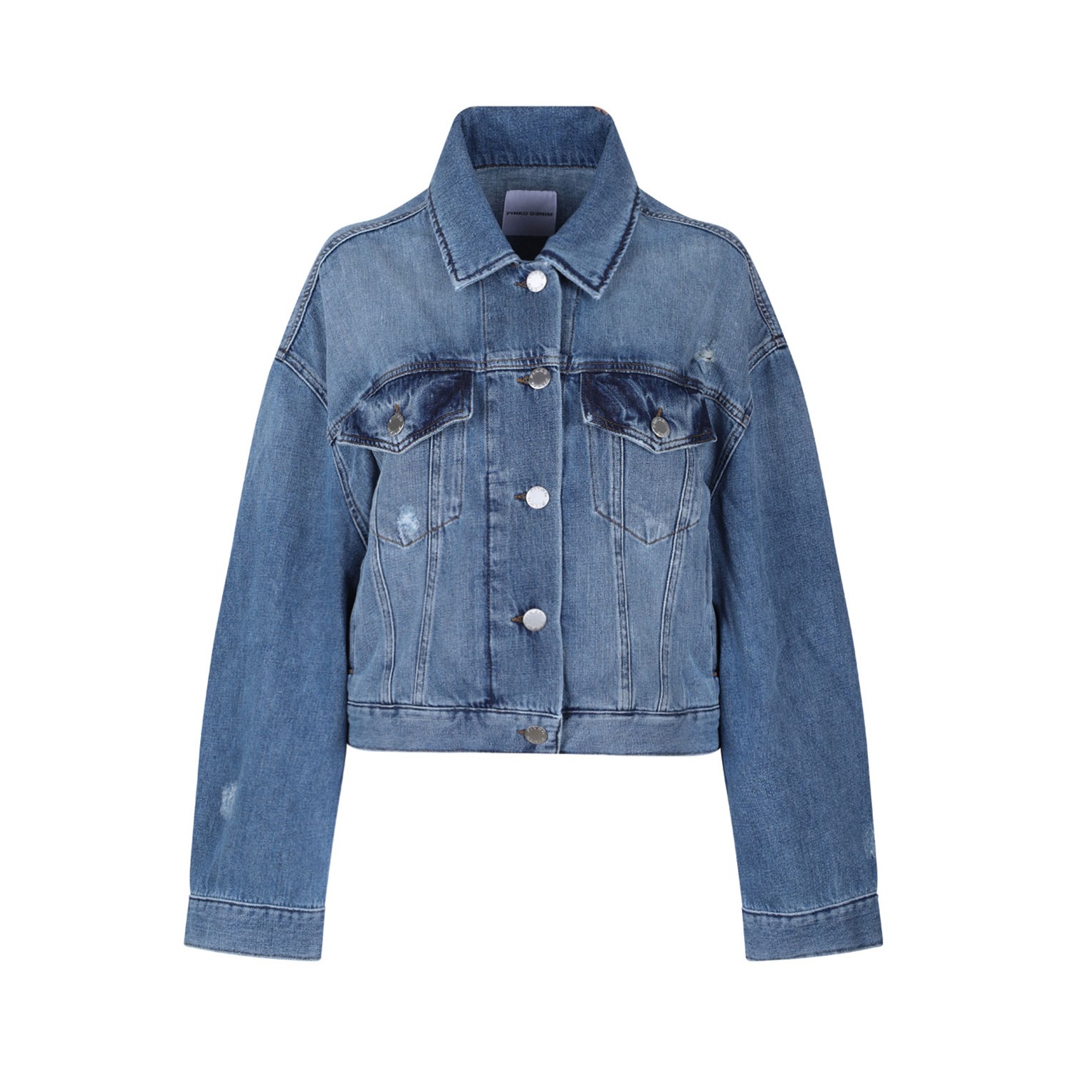 Pinko Blue Denim Jacket. Blue cotton denim jacket with front button fastening, chest flap pockets, buttoned cuffs, classic collar.