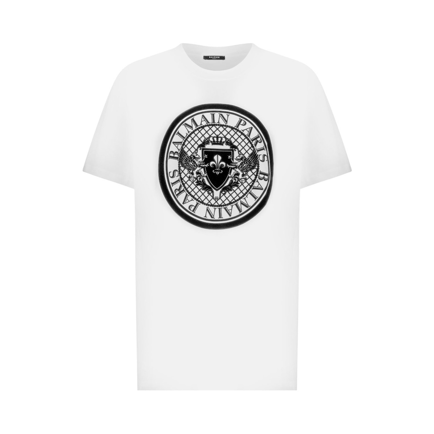 Balmain White Coin T-Shirt. White cotton t-shirt with logo print to the front, crew neck and short sleeves.