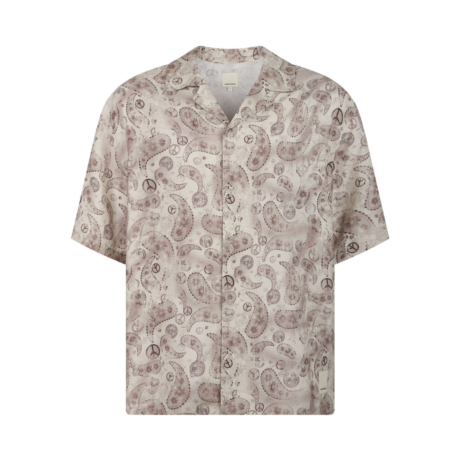 Emporio Armani Paisley Print Shirt. Light beige paisley print shirt with front button fastening, logo patch to the front, camp collar, short sleeves.