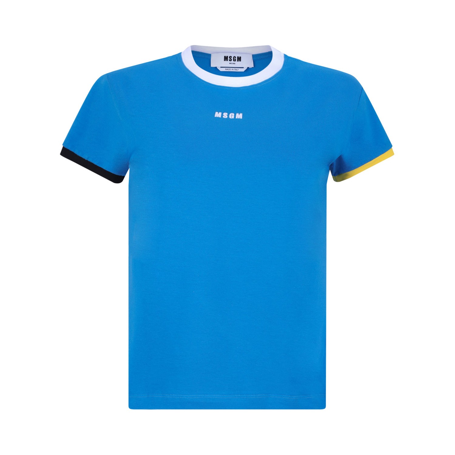 MSGM Ocean Blue Logo Embroidered T-Shirt. Ocean blue cotton t-shirt with logo embroidered to the front, crew neck, short sleeves, contrasting trim.