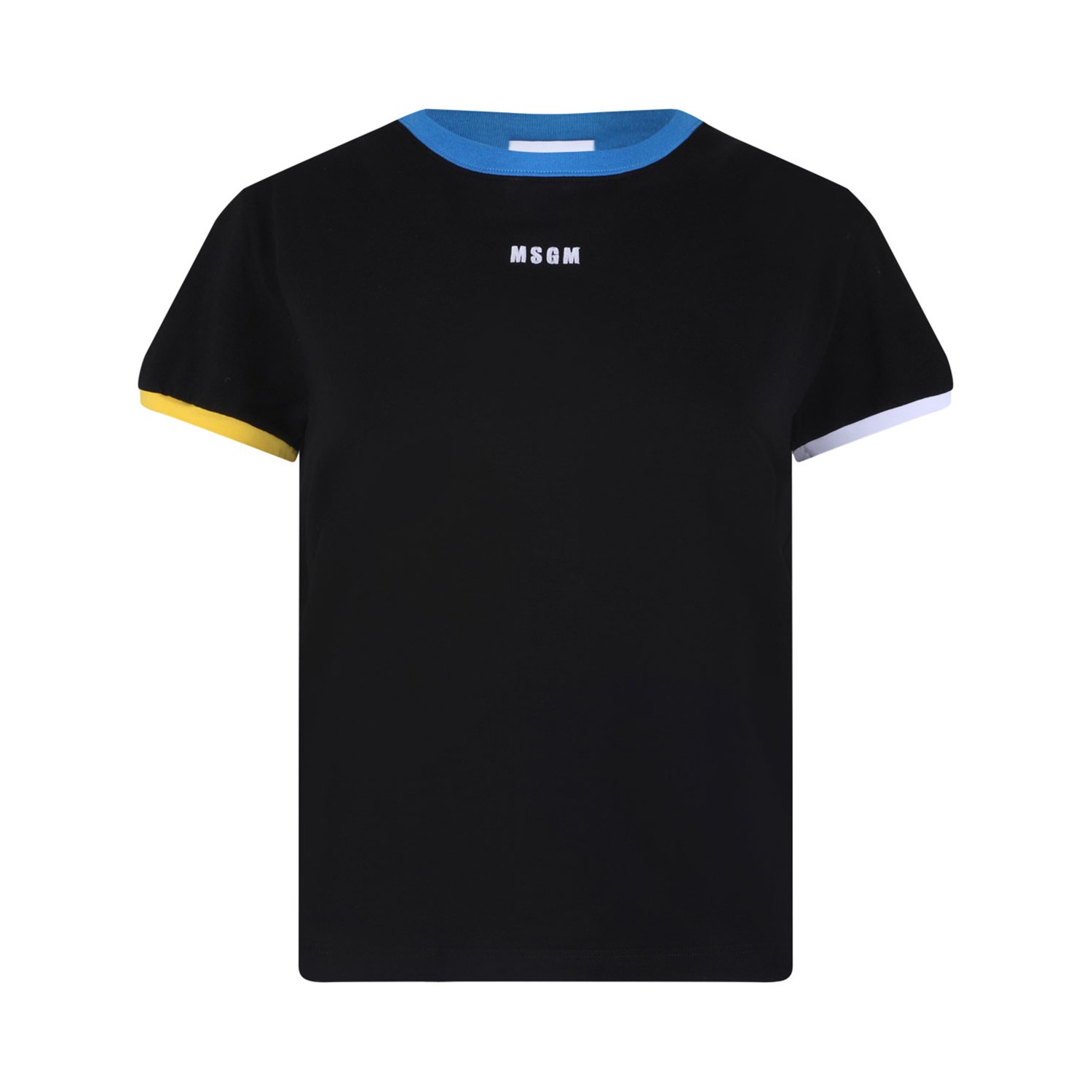 MSGM Black Logo Embroidered T-Shirt. Black cotton t-shirt with logo embroidered to the front, crew neck, short sleeves, contrasting trim.