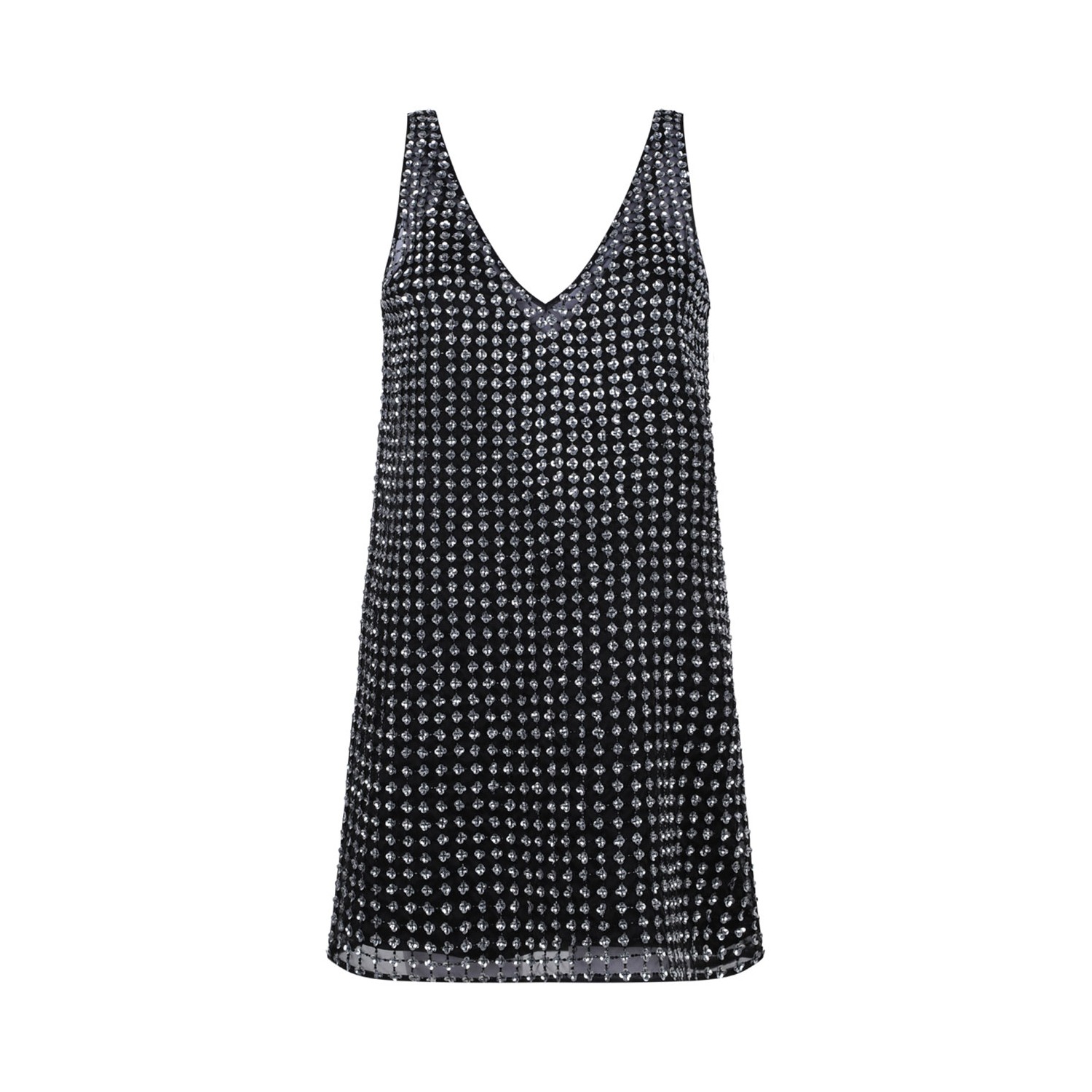 Max Mara Black Sequins Dress. Black short sleeveless dress, made of organza and entirely covered in all-over embroidered sequins with a flower motif. Straight-cut style with a V neck at the front and bare back framed by a deep round neckline at the back.