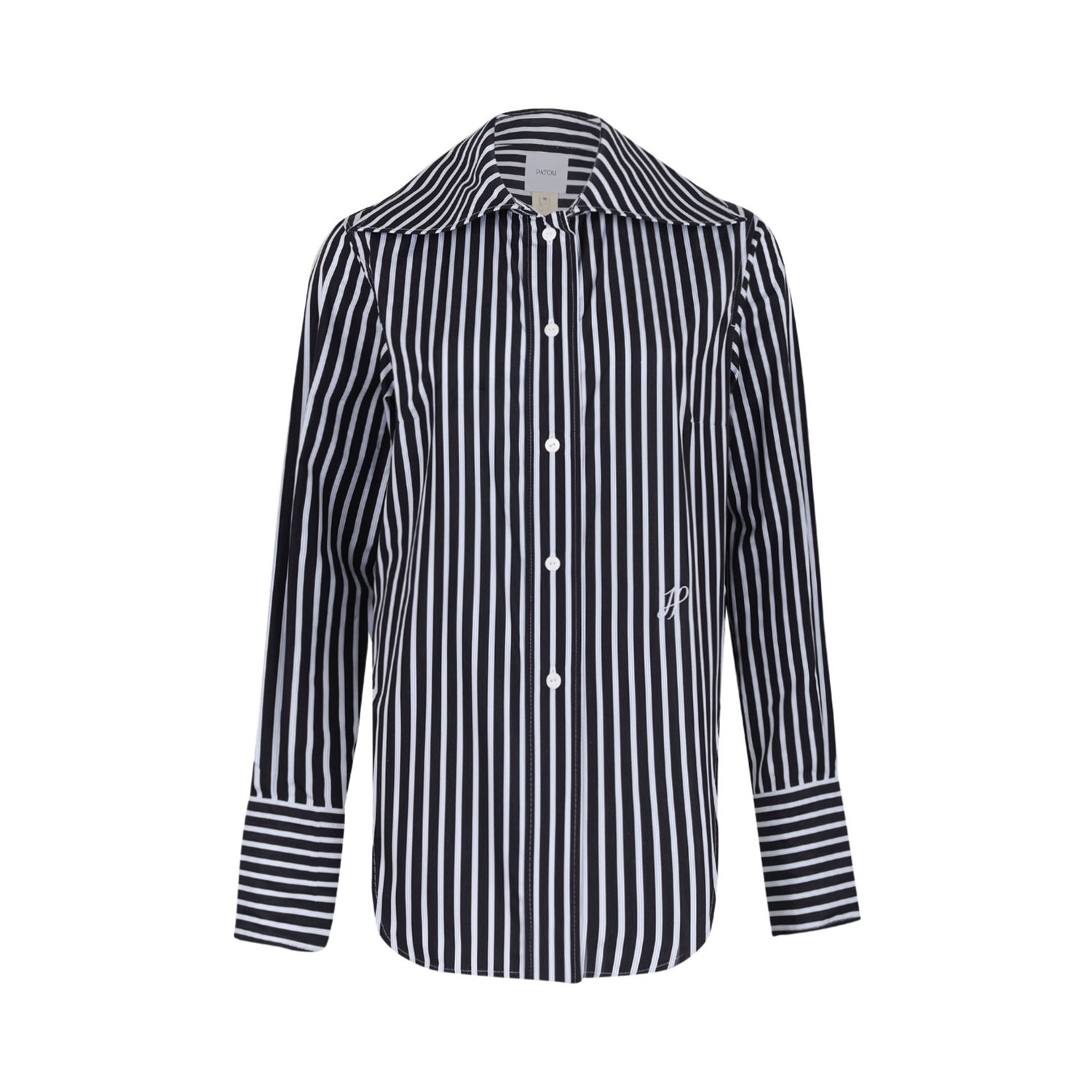 Patou Navy Blue Striped Shirt. Navy blue cotton striped shirt with front button fastening, oversized pointed collar, buttoned-cuff sleeves, curved hem.
