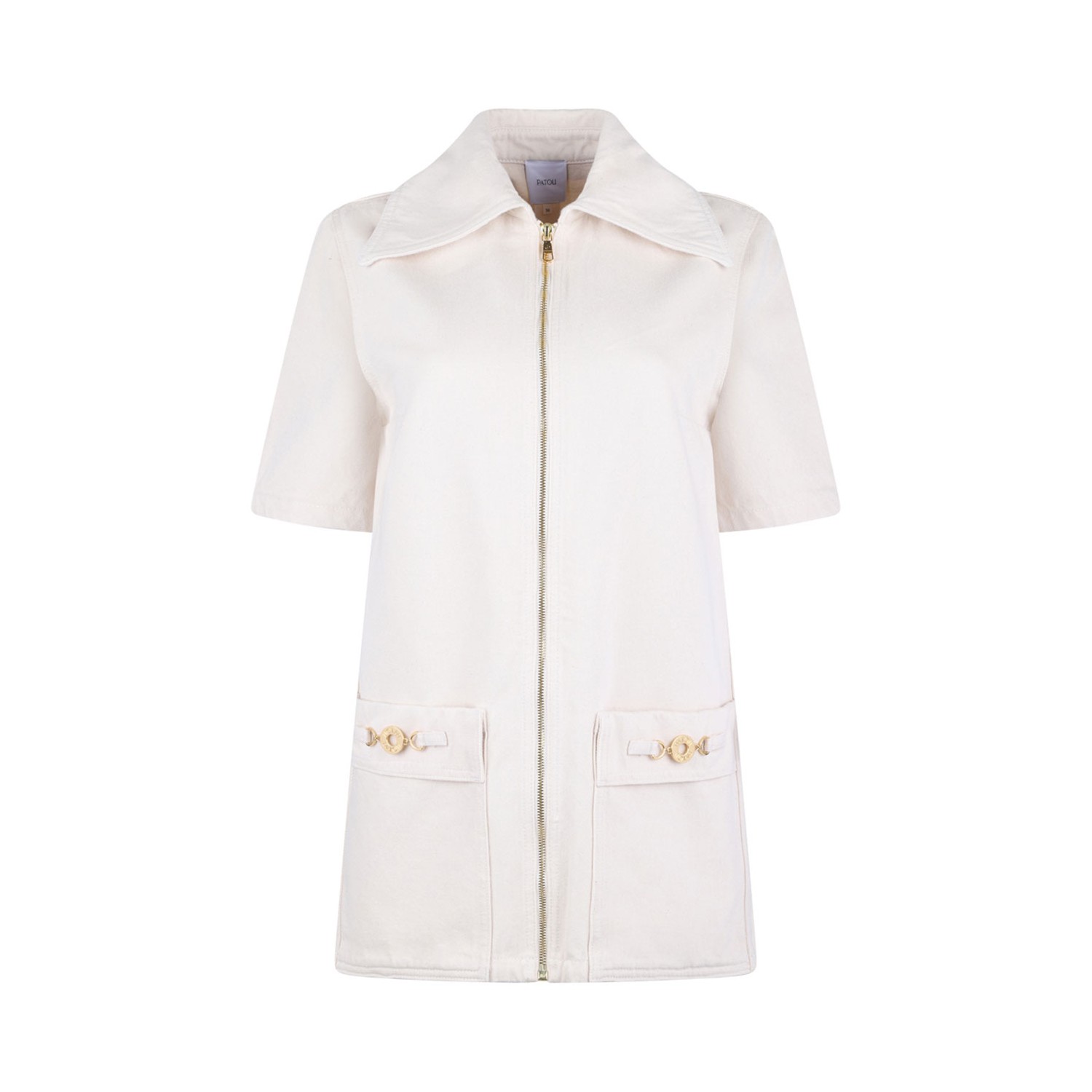 Patou Light Beige Denim Mini Dress. Light beige organic cotton denim mini dress with front zip fastening, two front patch pockets, logo plaque.