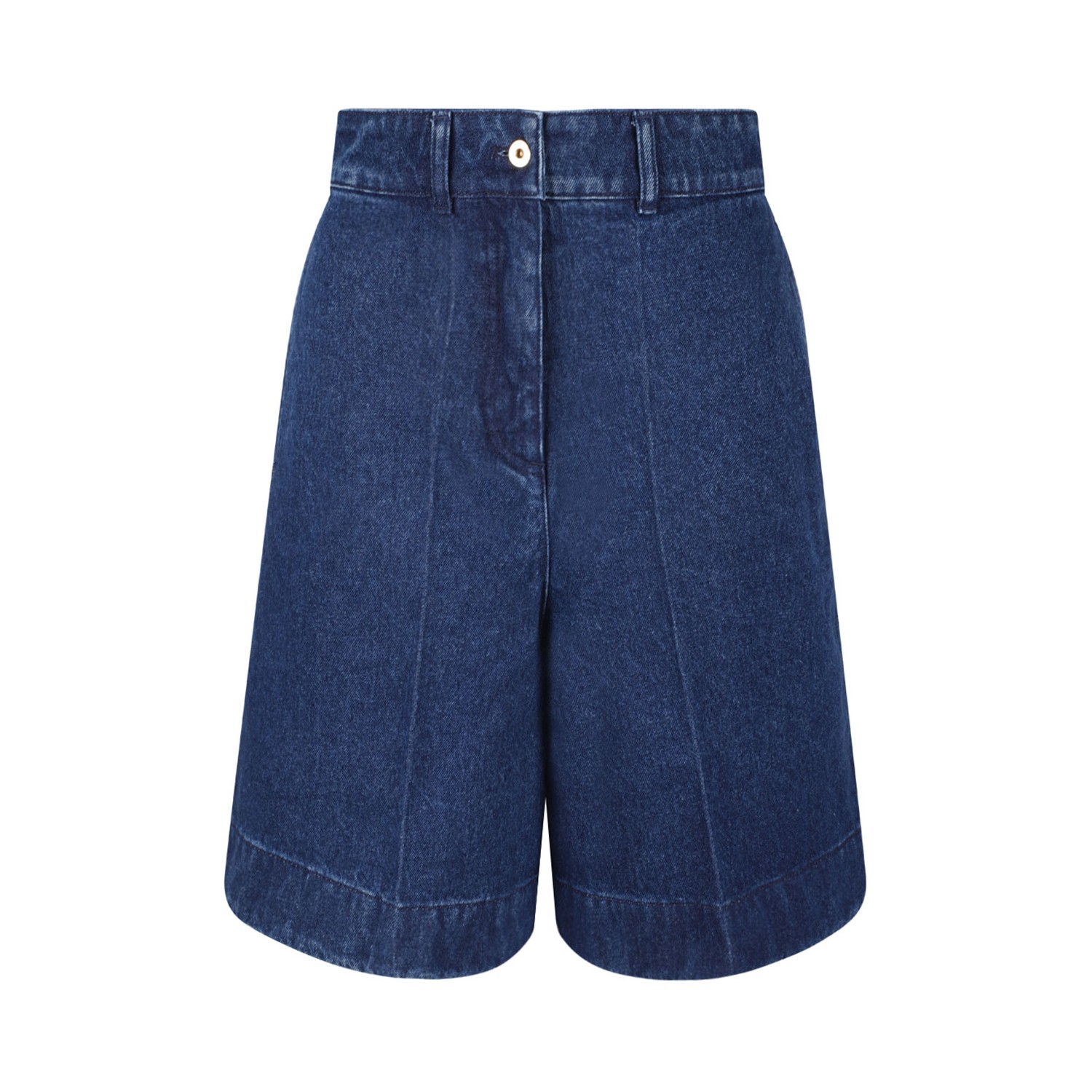 Patou Navy Blue Denim Shorts. Navy blue cotton denim shorts with concealed fly and button fastening. Belt loops, two side inset pockets, pressed crease.