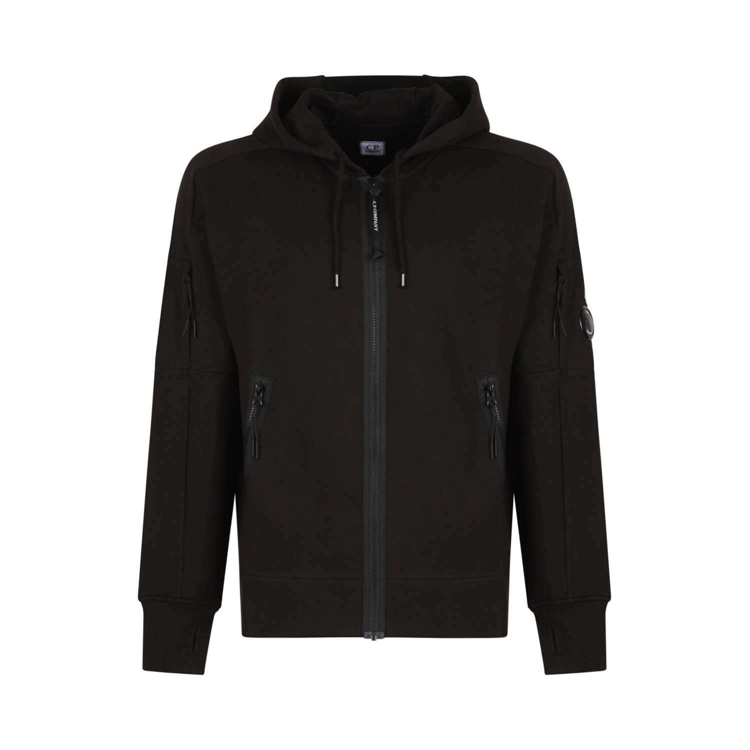 C.P. Company Black Lens Detailed Hoodie. Black cotton hoodie with signature Lens detail, logo print at the hood, drawstring hood. Front zip fastening, branded zip puller, long raglan sleeves. Ribbed cuffs and hem, front zip fastening pockets leeve zip pocket, French terry lining.