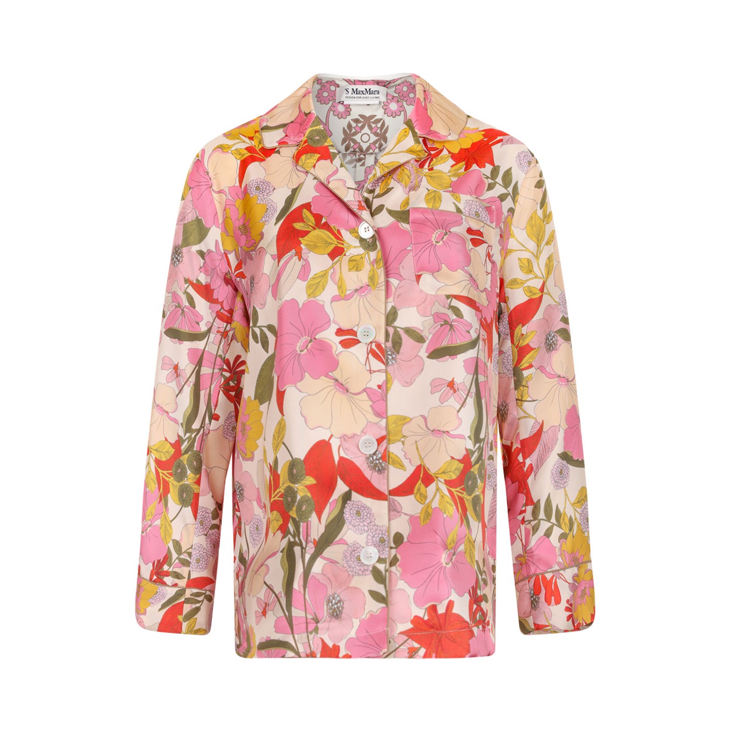 Max Mara Pink Silk Shirt. Pyjama shirt in precious pure silk twill, with an all-over printed motif. The model is characterised by a fluid silhouette with a bowling collar, long set-in sleeves and a patch pocket on the chest. Finished with cotton voile piping and side slits, it closes with visible buttons on the front.