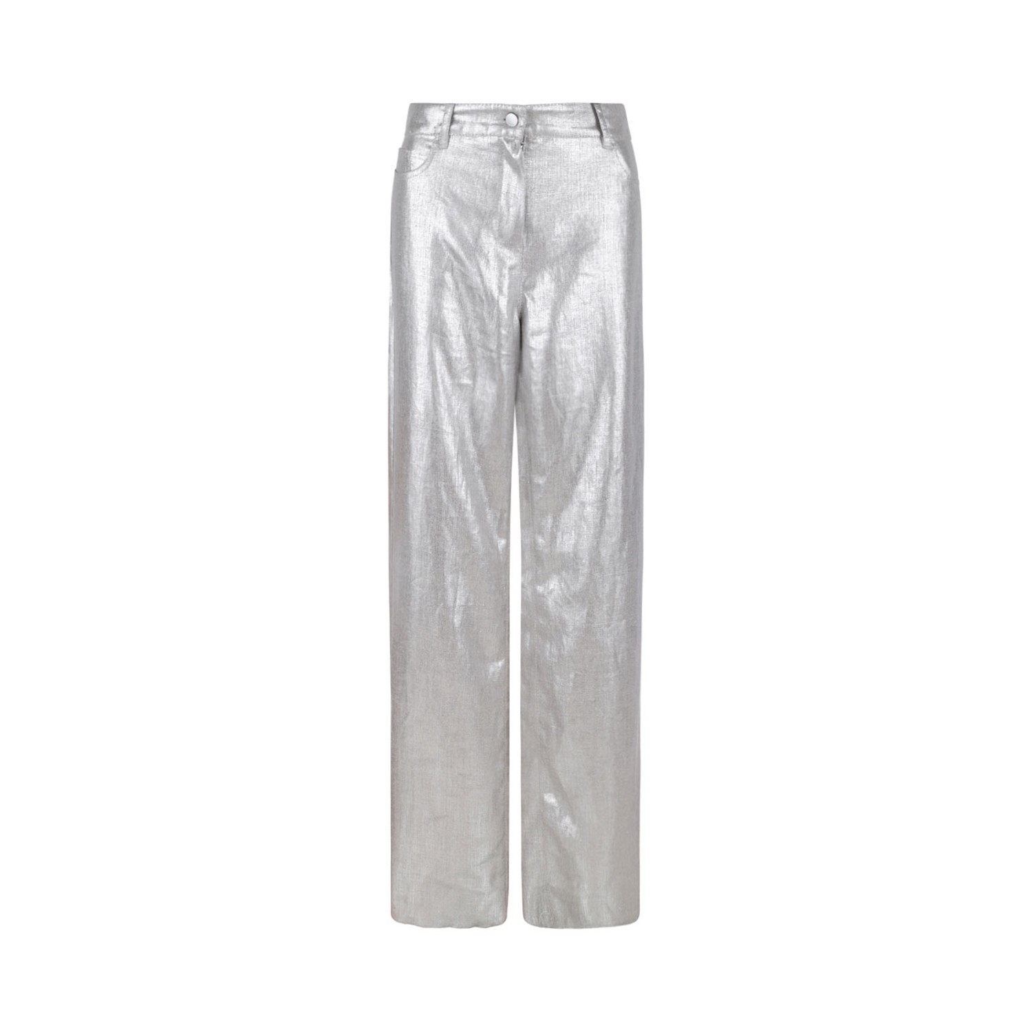 Max Mara Silver Linen Trousers. Straight-fit 5-pocket trousers in plated pure linen canvas. The model boasts belt loop detail, a yoke and patch rear pockets. Fly-covered zip and tack button fastening.