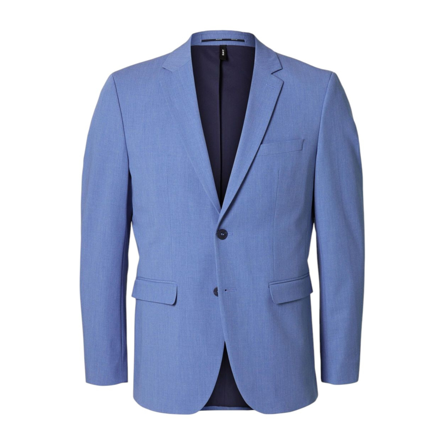Selected Light Blue Tailored Blazer. Light blue tailored blazer, single breasted, notched lapels with buttonhole detail, two button closure, long sleeves with buttoned cuffs, welted chest pocket, jetted front pockets, double vented, lined.