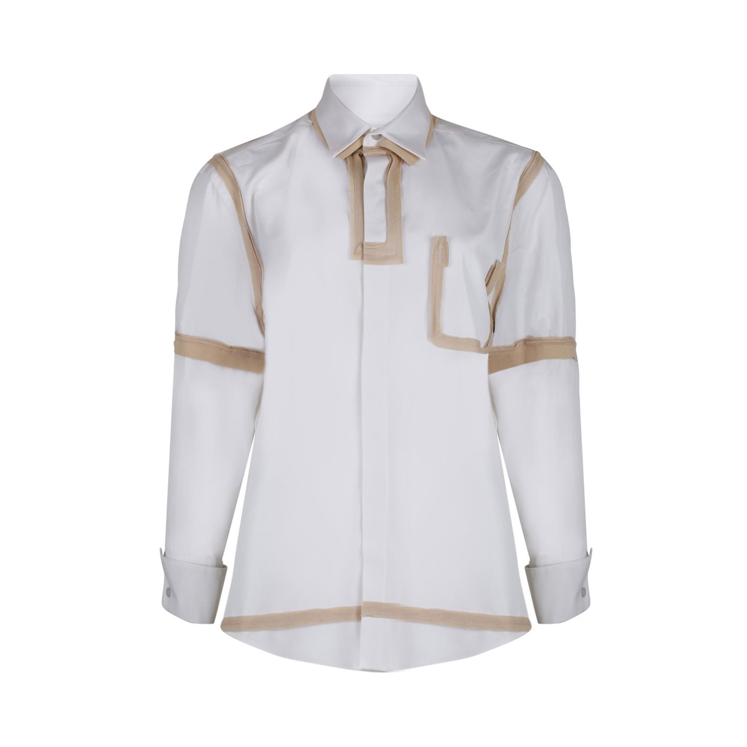 Maison Margiela White Shirt. White cotton shirt, signature four-stitch logo, embroidered logo, front button fastening. Classic collar, long sleeves, front patch pocket, stripe detailing, curved hem.