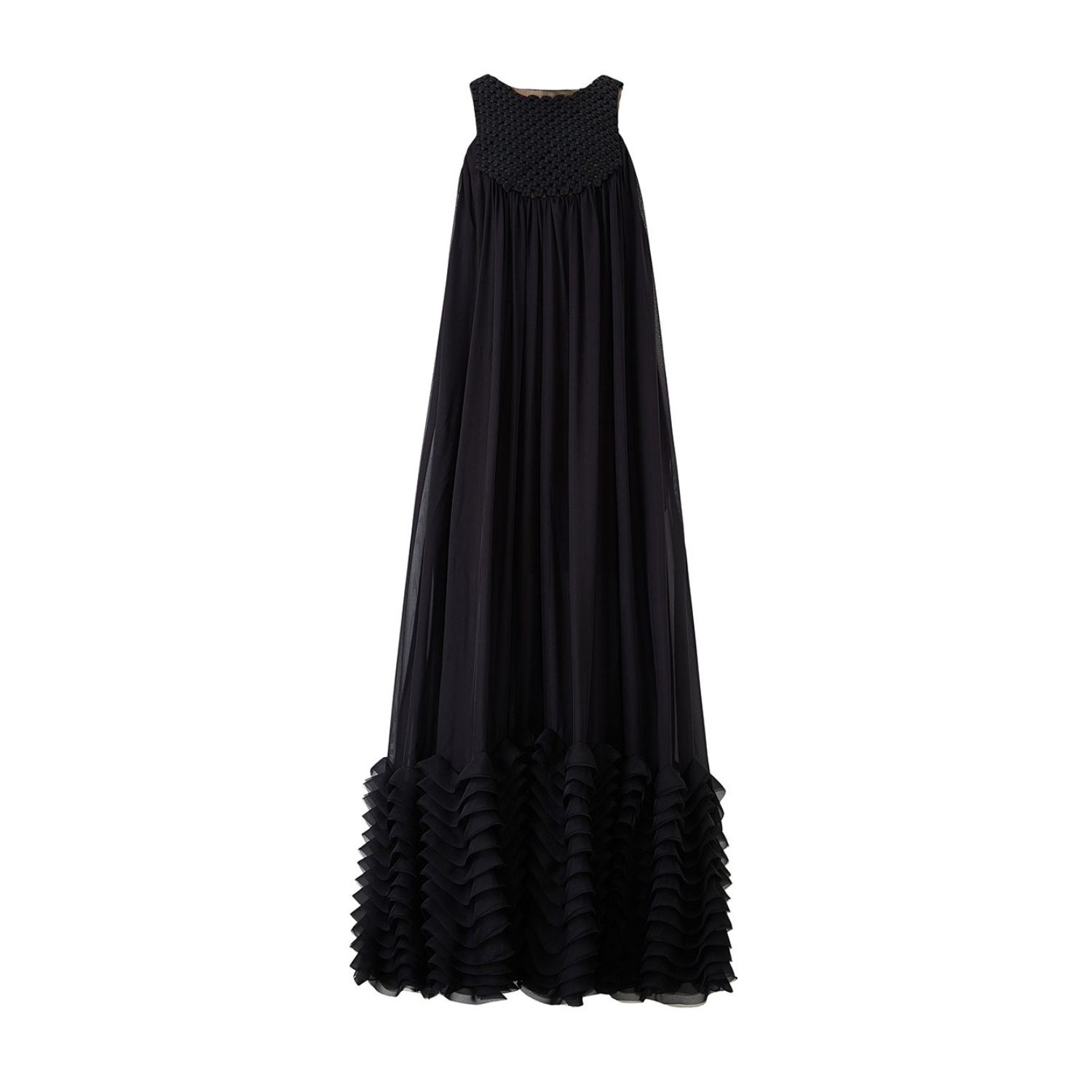 Hui Milano Black Evening Gown. Black long gown with a textured woven bodice, sleeveless design, flowing pleated skirt, and structured ruffled hemline.