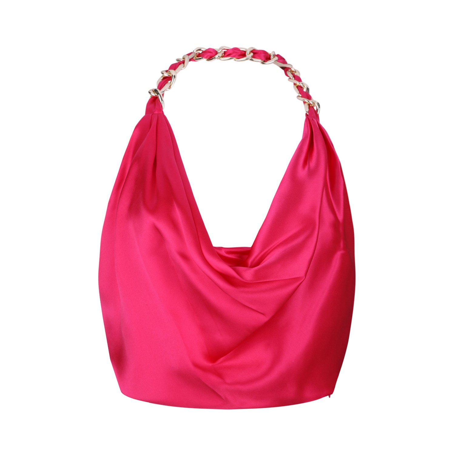 Balmain Deep Pink Silk Top. Deep pink silk top with chain-strap, V-neck, sleeveless, draped design, cropped.