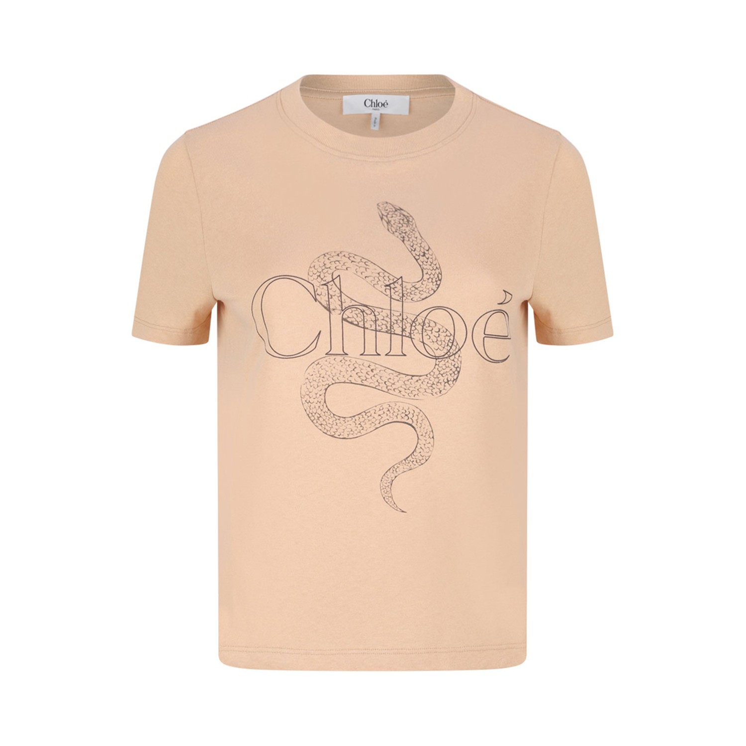 Chloe Beige Snake Print T-Shirt. Beige cotton t-shirt with crew neck, short sleeves, logo print to the front, graphic print to the front.
