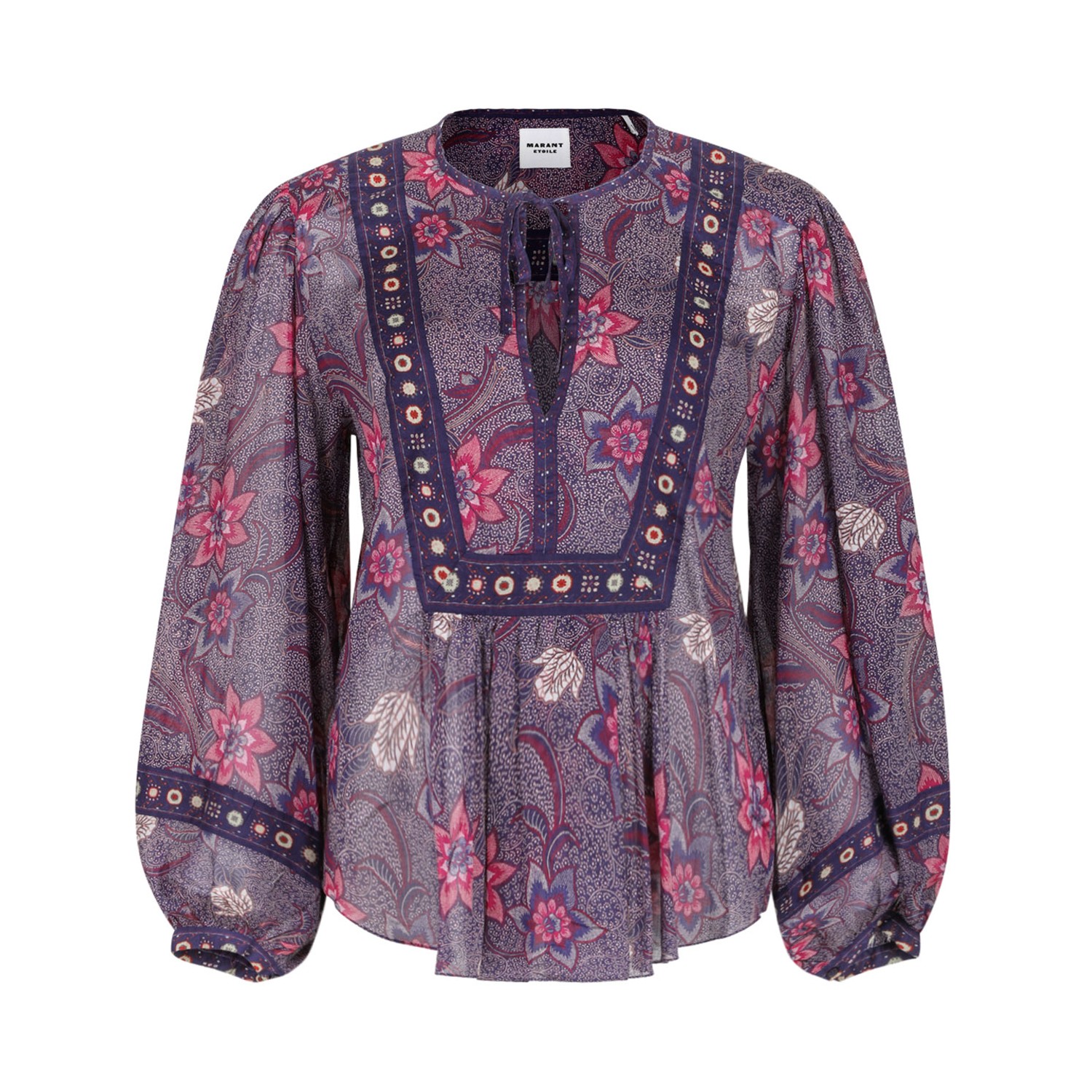 Isabel Marant Purple Gayle Blouse. Purple cotton blouse with front tie fastening, V-neck, long sleeves, buttoned cuffs, all over floral print.