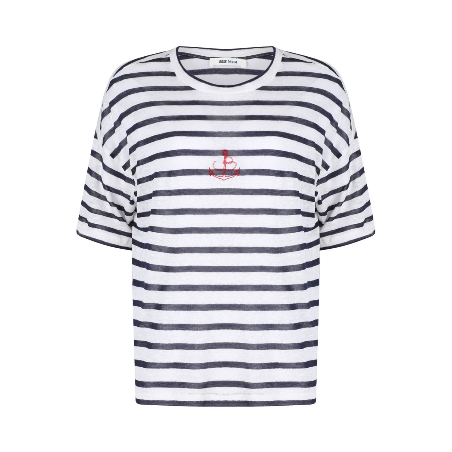 Merci White and Blue Striped T-Shirt. White and blue striped t-shirt with crew neck, front red graphic print, short sleeves.