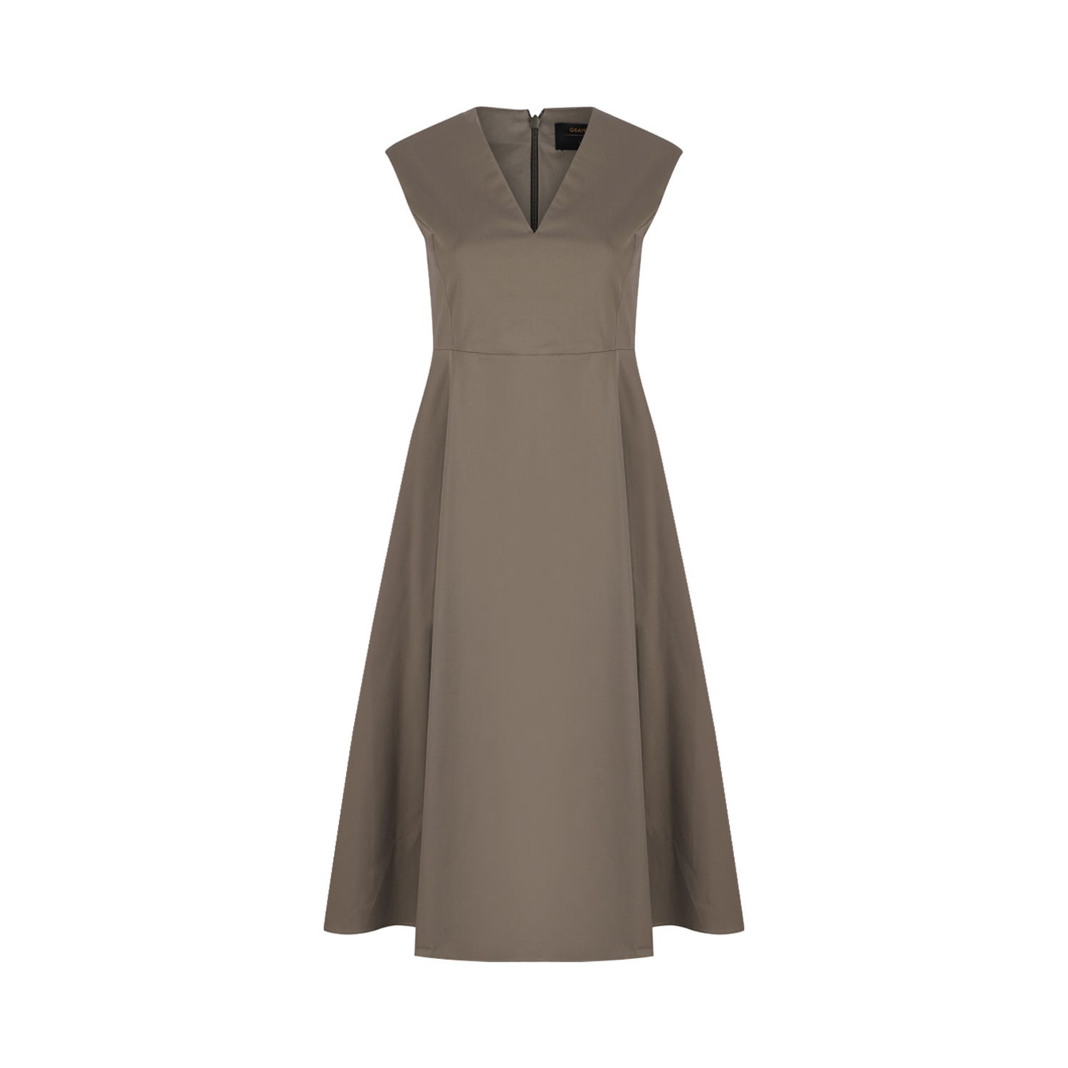 Gran Sasso Sleeveless Brown Dress. Brown sleeveless dress with V-neck, slim waist, wide skirt with pleats.