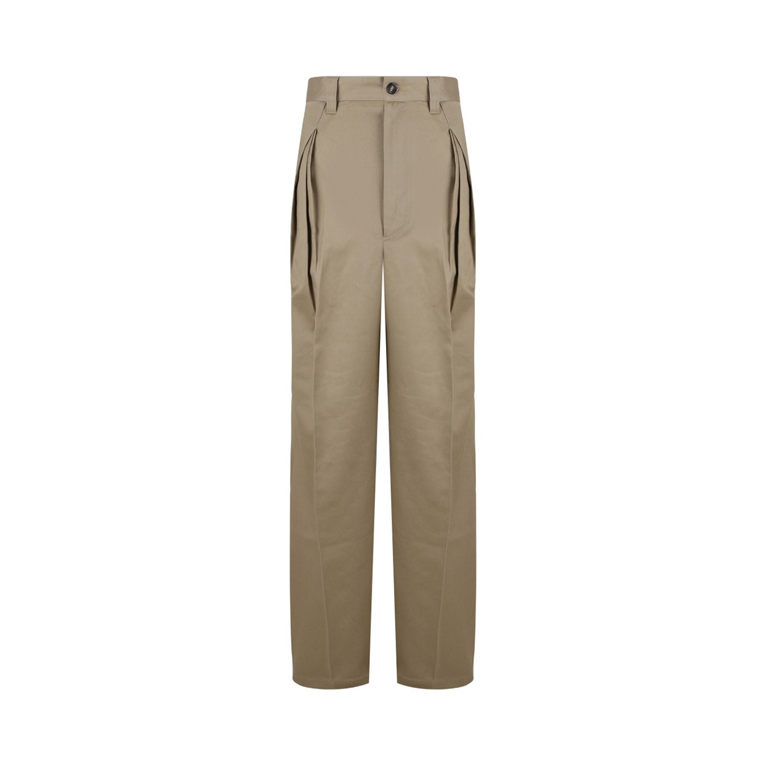 Maison Margiela Beige Straight Trousers. Beige twill weave pants, belt loops at the wasit, pintuck detailing, two side slash pockets. Pleat detailing, pressed crease, signature four-stitch logo, two rear jetted pockets, internal logo tag. Straight hem and front button and zip fastening.