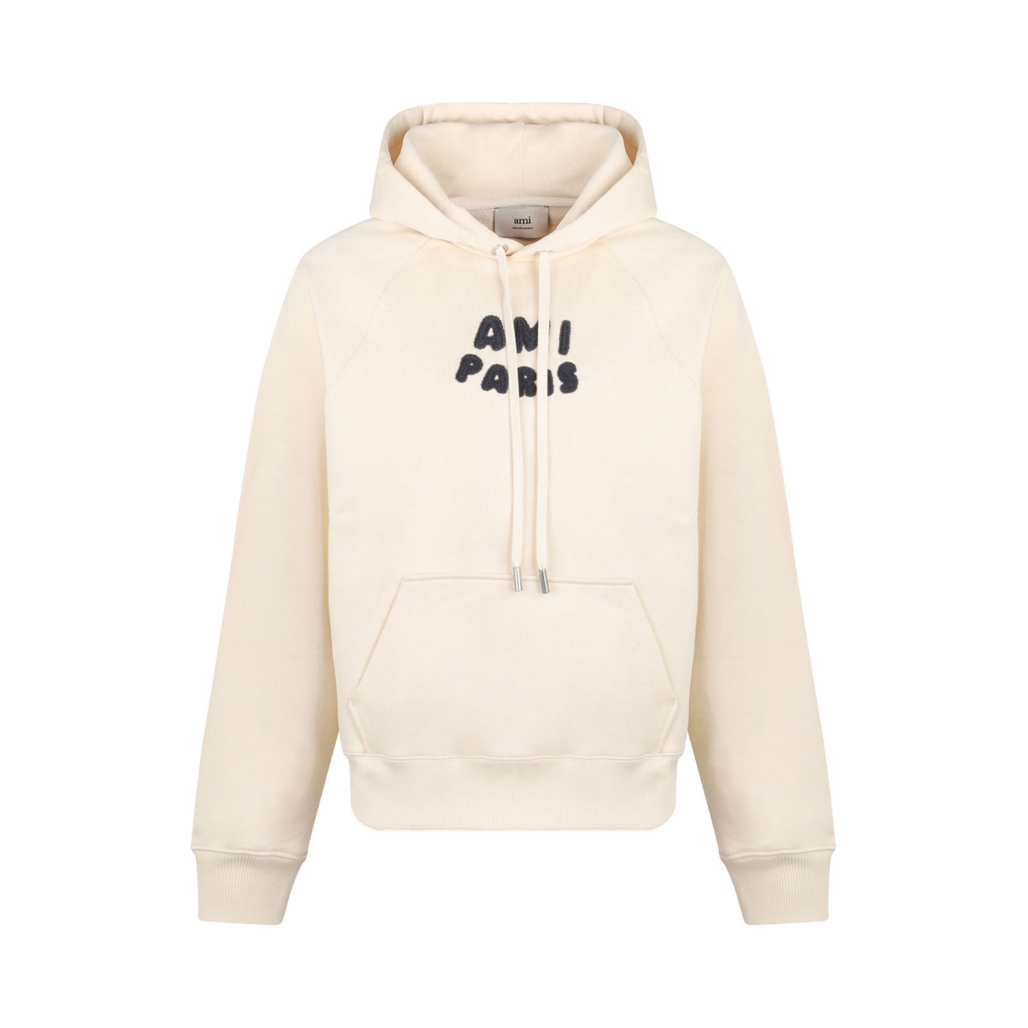 Ami Paris White Cream Logo Print Hoodie. White cream cotton logo print hoodie, front pouch pocket, drawstring hood, long sleeves.