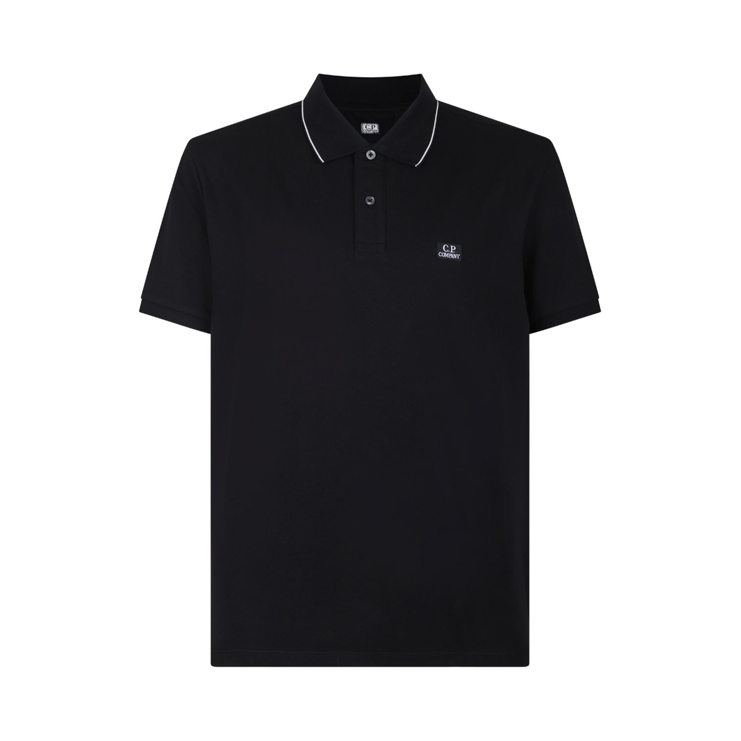 C.P. Company Black Polo Shirt. Black cotton polo shirt with front button placket, embroidered logo at the chest, stripe trim and polo collar.