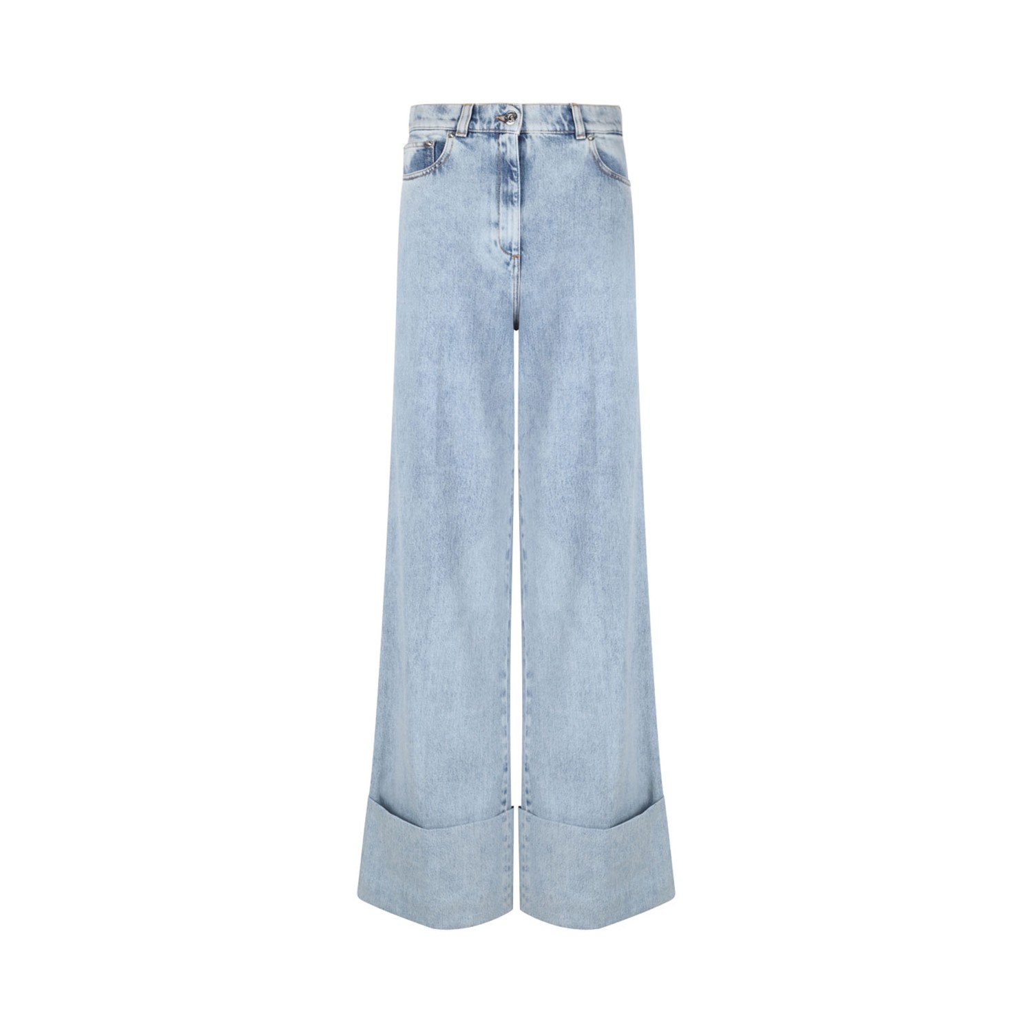 Lanvin Cyan Blue Wide Leg Jeans. Cyan blue cotton jeans, widel leg, concealed fly and button fastening. Classic five pockets, turn-up hem, logo patch to the rear.
