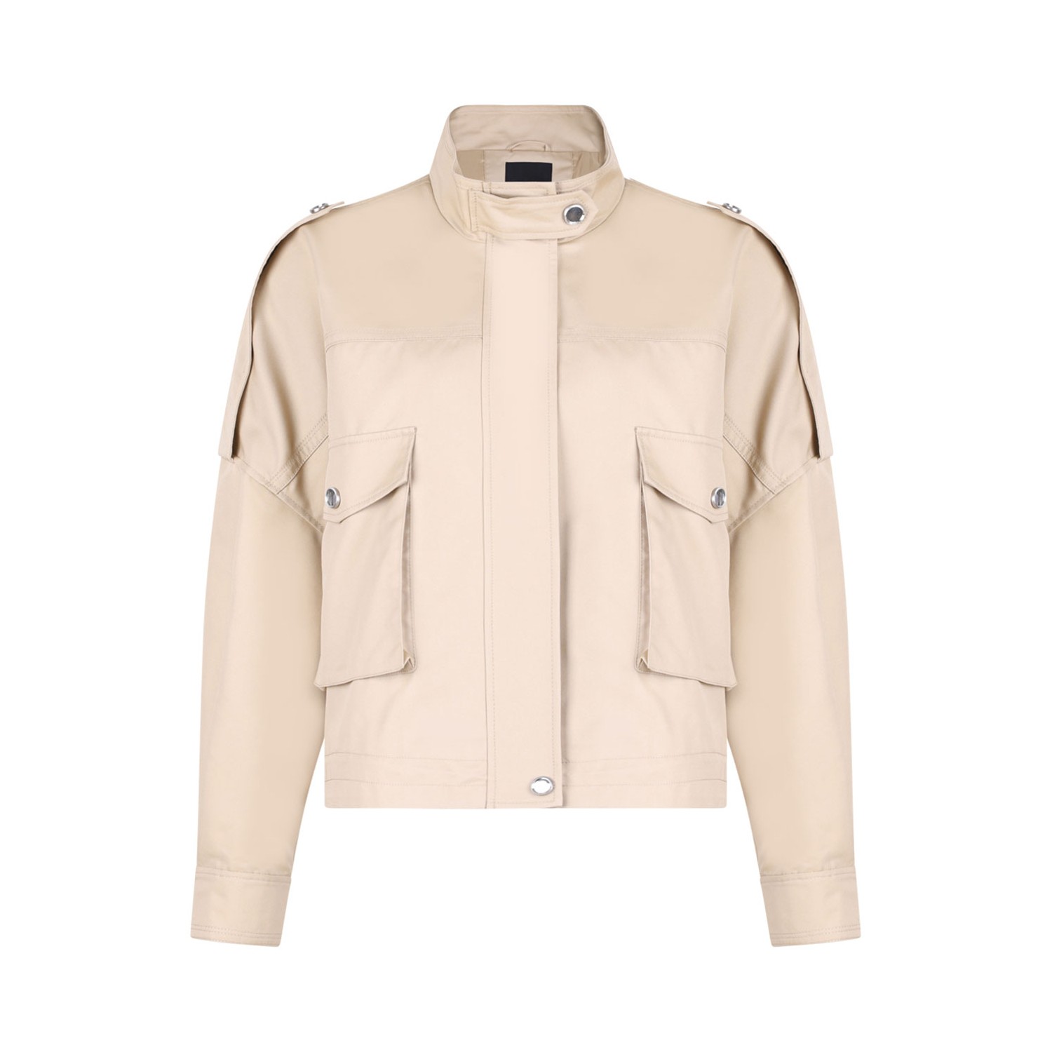 Pinko Beige Mock Neck Jacket. Beige cotton jacket with mock neck, concealed front fastening, epaulettes. Two front flap pockets and drawstring hem.